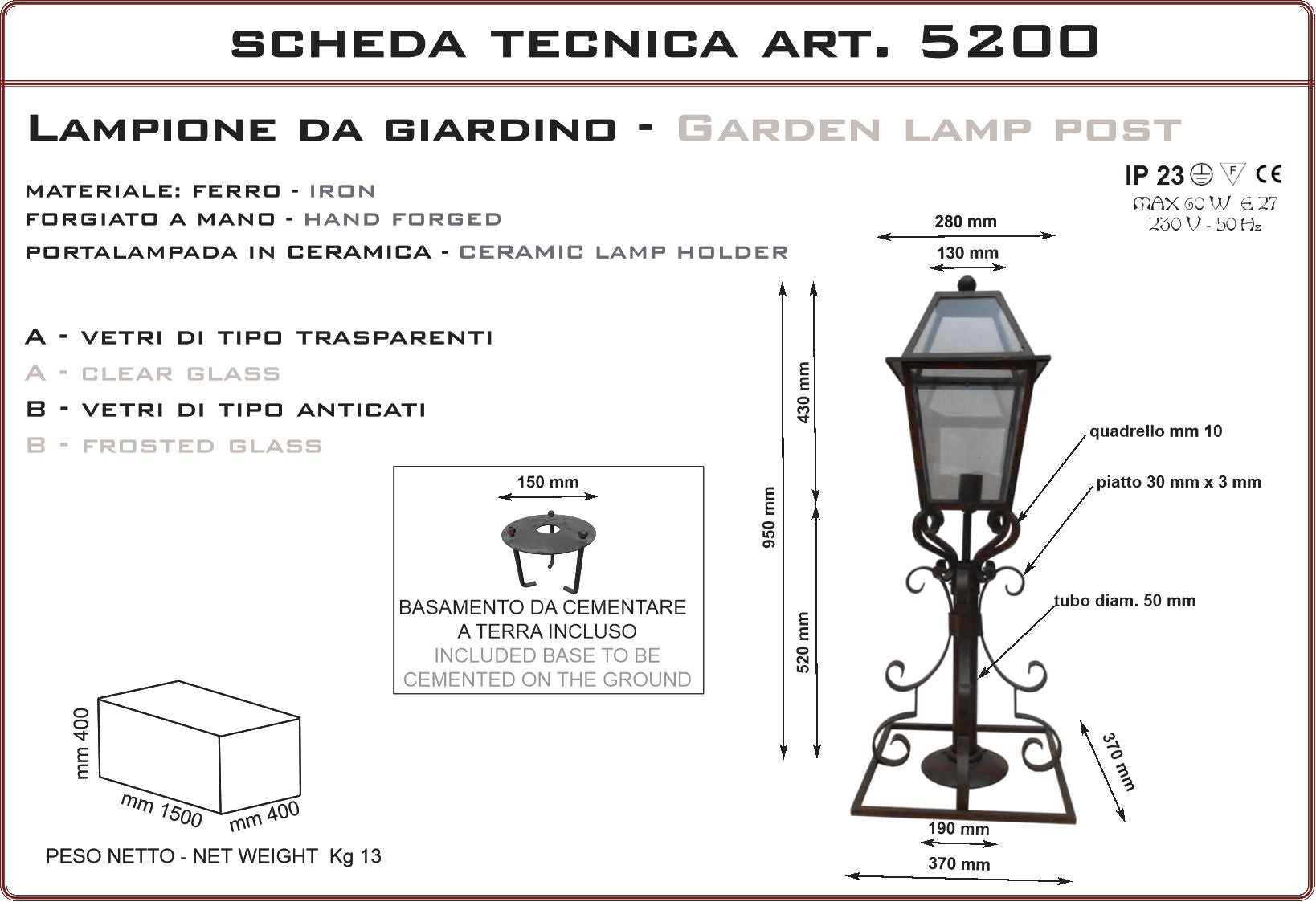 Lampione da giardino in stile toscano, con decorazione della base forgiata a mano e corpo illuminante a quattro facce in vetro. Prodotto artigianale realizzato in Italia, particolarmente adatto per ville di campagna,  casali in pietra , rustici, agriturismi , country houses,  cascine, residenze d' epoca,  masserie e  masi. Portalampada in ceramica rivestito in ferro. La finitura, in  ferro vecchio, è realizzata con cere antichizzanti color ruggine. Essendo  eseguita a mano può avere  differenti  tonalità  tra un prodotto e l’altro. É possibile sopraverniciare il prodotto con qualsiasi vernice o trattamento.