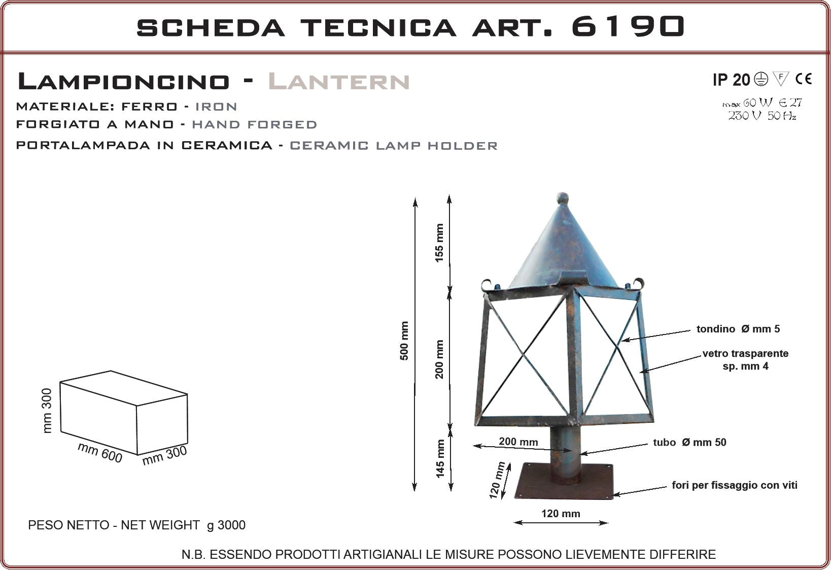 Tradizionale lampioncino da giardino, a lanterna, in stile toscano,di forma svasata con vetri. Prodotto artigianale realizzato in Italia, particolarmente adatto per ville di campagna, casali in pietra e rustici, agriturismi e country houses, cascine, residenze d' epoca, masserie e masi. Portalampada in plastica rivestito in ferro, finitura in ferro vecchio realizzata con prodotti antiruggine da esterno e finita con cere antichizzanti. Essendo eseguita a mano può avere differenti tonalità tra un prodotto e l’altro. É possibile sopraverniciare il prodotto con qualsiasi vernice o trattamento.