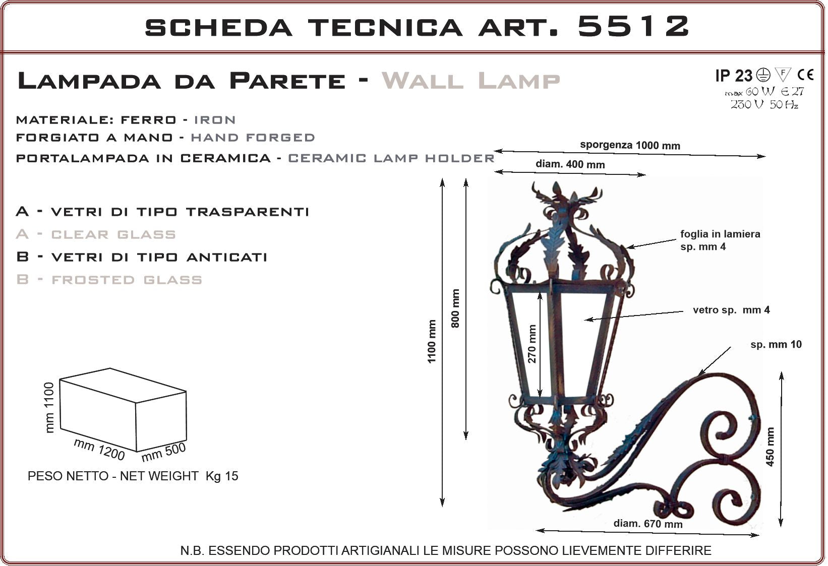 Lanterna da parete di grandi dimensioni  in ferro  battuto, stile Liberty arte povera, elegante forgiatura artigianale con foglie decorative. Prodotto artigianale realizzato in Italia, particolarmente adatto per ville di campagna, casali in pietra, rustici, agriturismi,  country houses  cascine, residenze d'epoca,  masserie e masi. Portalampada in ceramica rivestito in ferro con finitura in  ferro vecchio realizzata con prodotti antiruggine da esterno e finita con cere antichizzanti color ruggine. Essendo  eseguita a mano può avere  differenti  tonalità  tra un prodotto e l’altro. É possibile sopraverniciare il prodotto con qualsiasi vernice o trattamento.