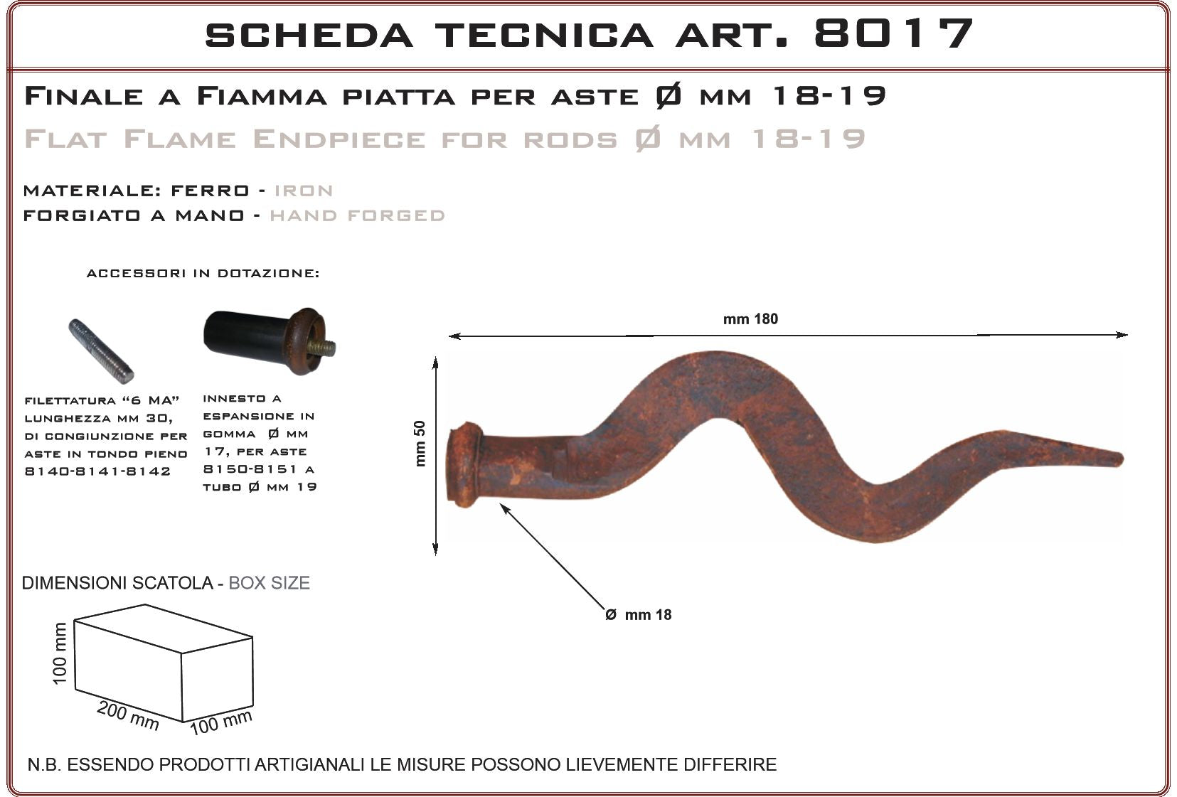 Flat flame finish for rods, in forged iron.. Handcrafted product made in Italy, particularly suitable for country villas, stone and rustic farmhouses, farmhouses and country houses, farmhouses, period residences, farms and farmhouses. The old iron finish is made with anti-rust products also suitable for outdoor use and finished with antiquing waxes. Being done by hand can have different shades between one product and another. It is possible to overpaint the product with any paint or treatment.
