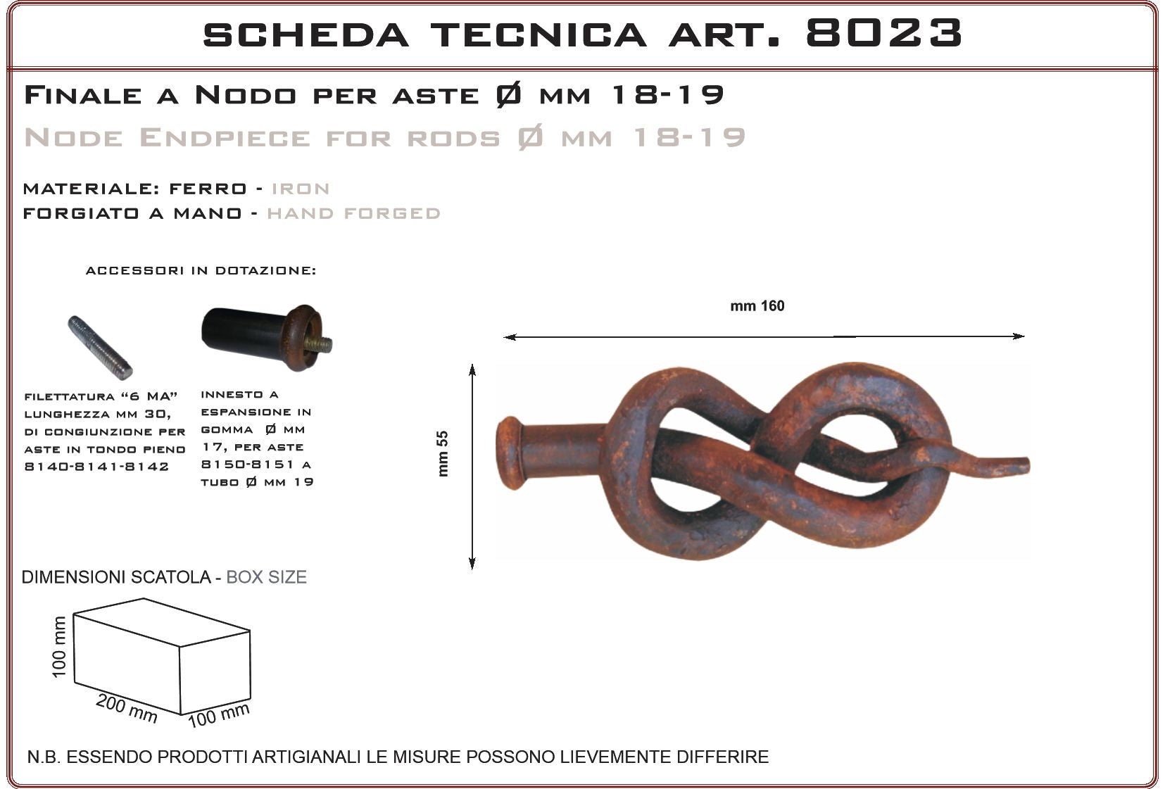 Knot ending for rods, in forged iron. Handcrafted product made in Italy, particularly suitable for country villas, stone and rustic farmhouses, farmhouses and country houses, farmhouses, period residences, farms and farmhouses. The old iron finish is made with anti-rust products also suitable for outdoor use and finished with antiquing waxes. Being done by hand can have different shades between one product and another. It is possible to overpaint the product with any paint or treatment.