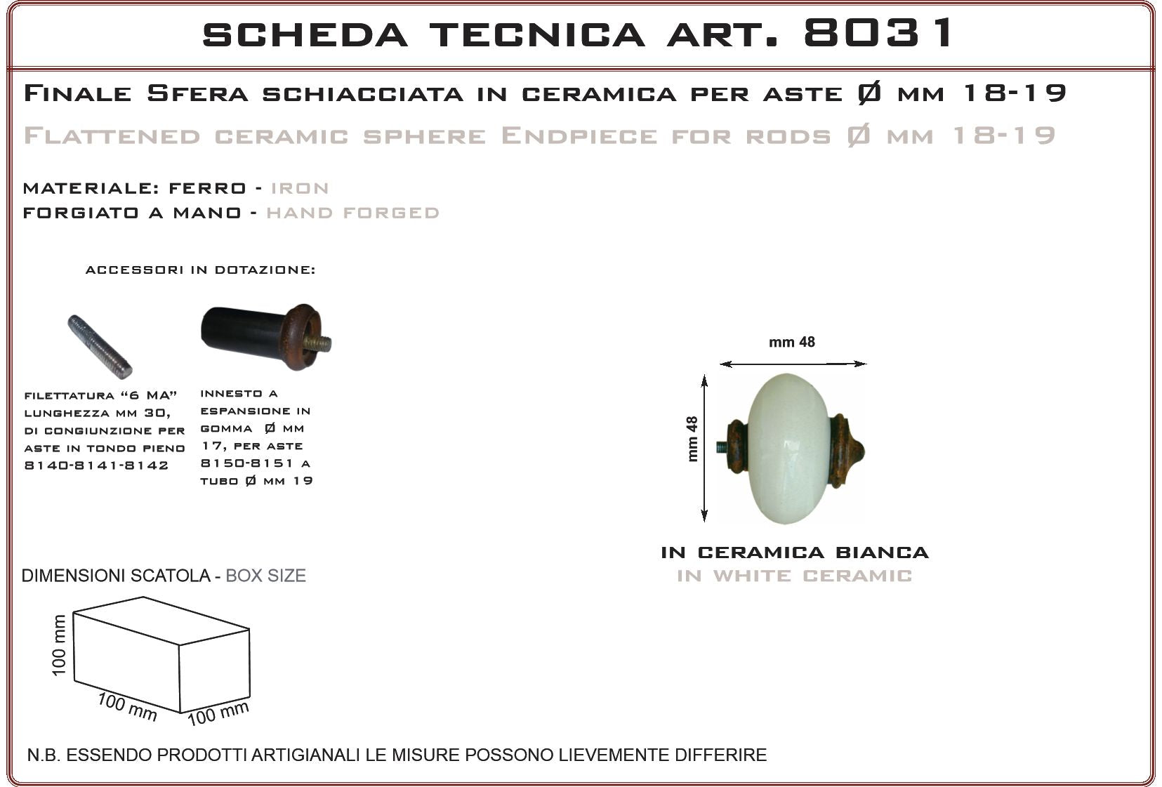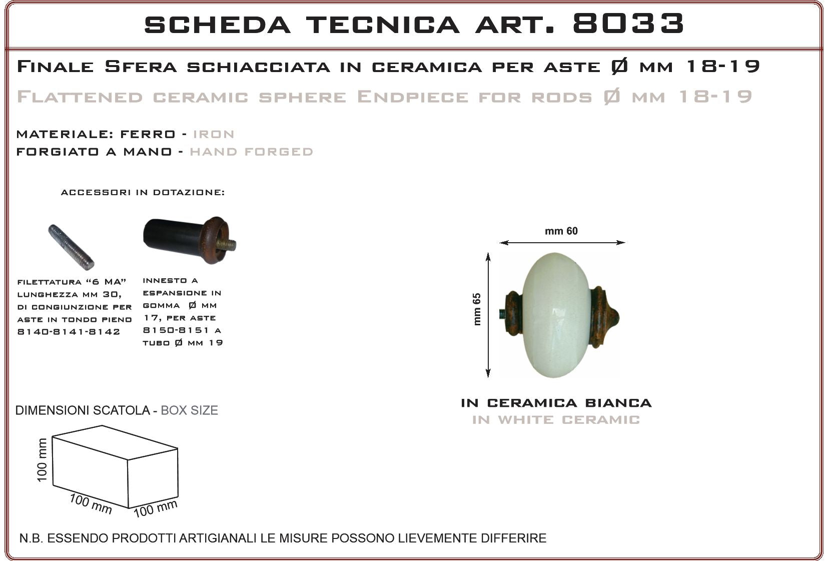 Finale a sfera schiacciata per aste in ceramica bianca. Prodotto artigianale realizzato in Italia, particolarmente adatto per ville di campagna, casali in pietra e rustici, agriturismi e country houses, cascine, residenze d'epoca, masserie e masi. La finitura ferro vecchio è realizzata con prodotti antiruggine adatti anche per esterno e finita con cere antichizzanti . Essendo eseguita a mano può avere differenti tonalità tra un prodotto e l’altro. É possibile sopraverniciare il prodotto con qualsiasi vernice o trattamento.