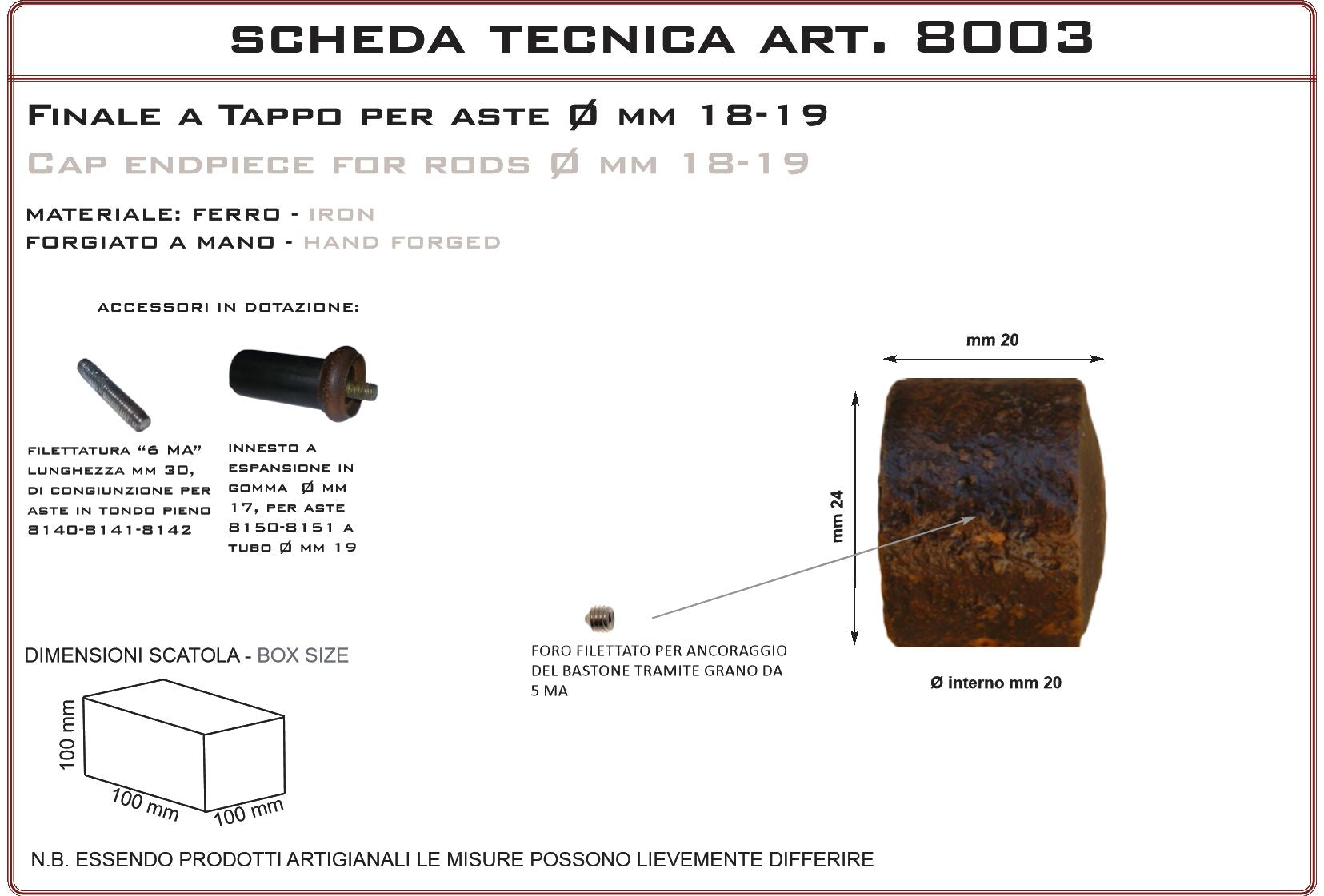 Finale a tappo per aste, in ferro forgiato. Prodotto artigianale realizzato in Italia, particolarmente adatto per ville di campagna, casali in pietra e rustici, agriturismi e country houses, cascine, residenze d' epoca, masserie e masi. La finitura ferro vecchio è realizzata con prodotti antiruggine adatti anche per esterno e finita con cere antichizzanti. Essendo eseguita a mano può avere differenti tonalità tra un prodotto e l’altro. É possibile sopraverniciare il prodotto con qualsiasi vernice o trattamento.