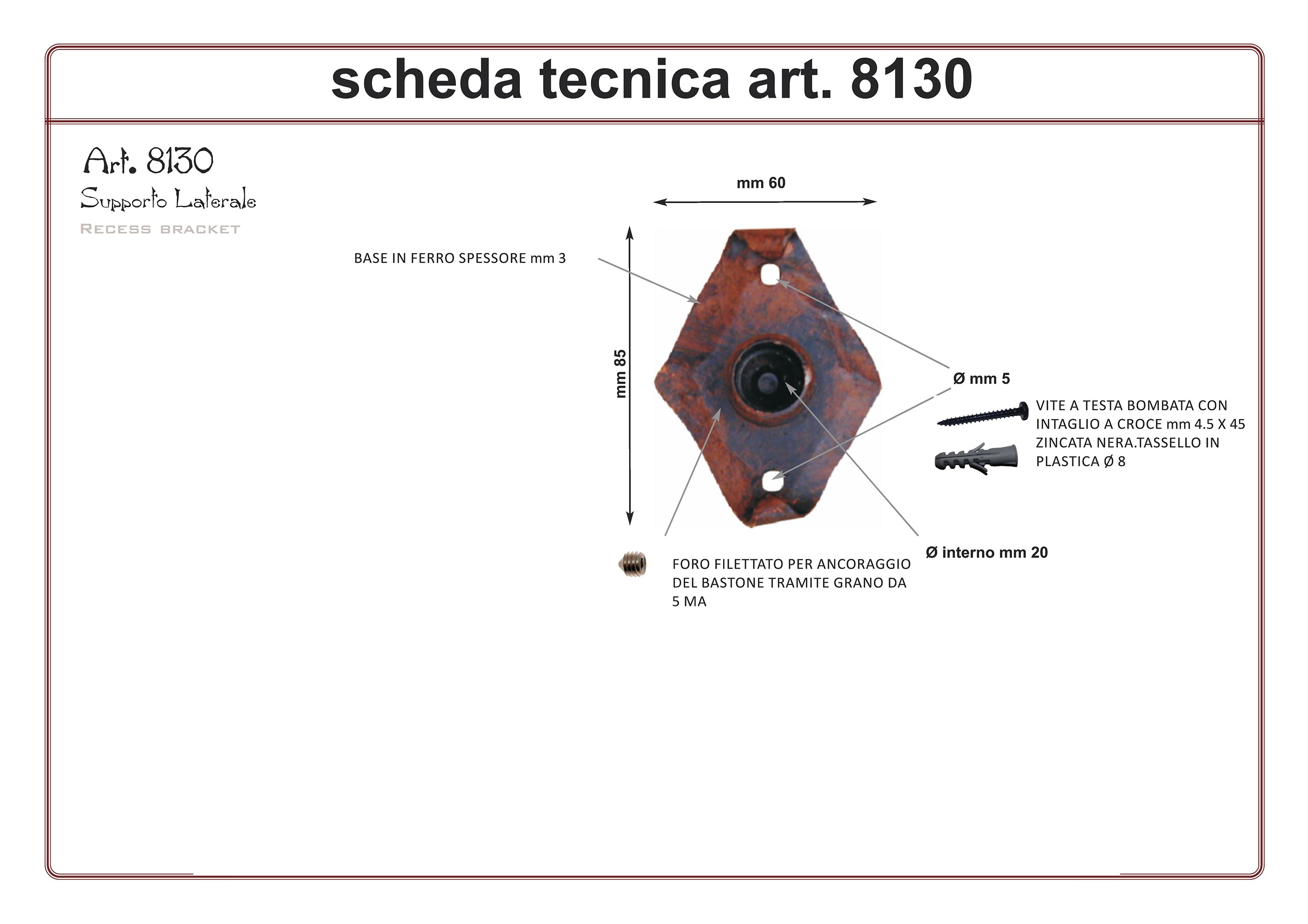 Lateral support with rhombus base for rods. Handcrafted product made in Italy, particularly suitable for country villas, stone and rustic farmhouses, farmhouses and country houses, farmhouses, period residences, farms and farmhouses. The old iron finish is made with anti-rust products also suitable for outdoor use and finished with antiquing waxes. Being done by hand can have different shades between one product and another. It is possible to overpaint the product with any paint or treatment.