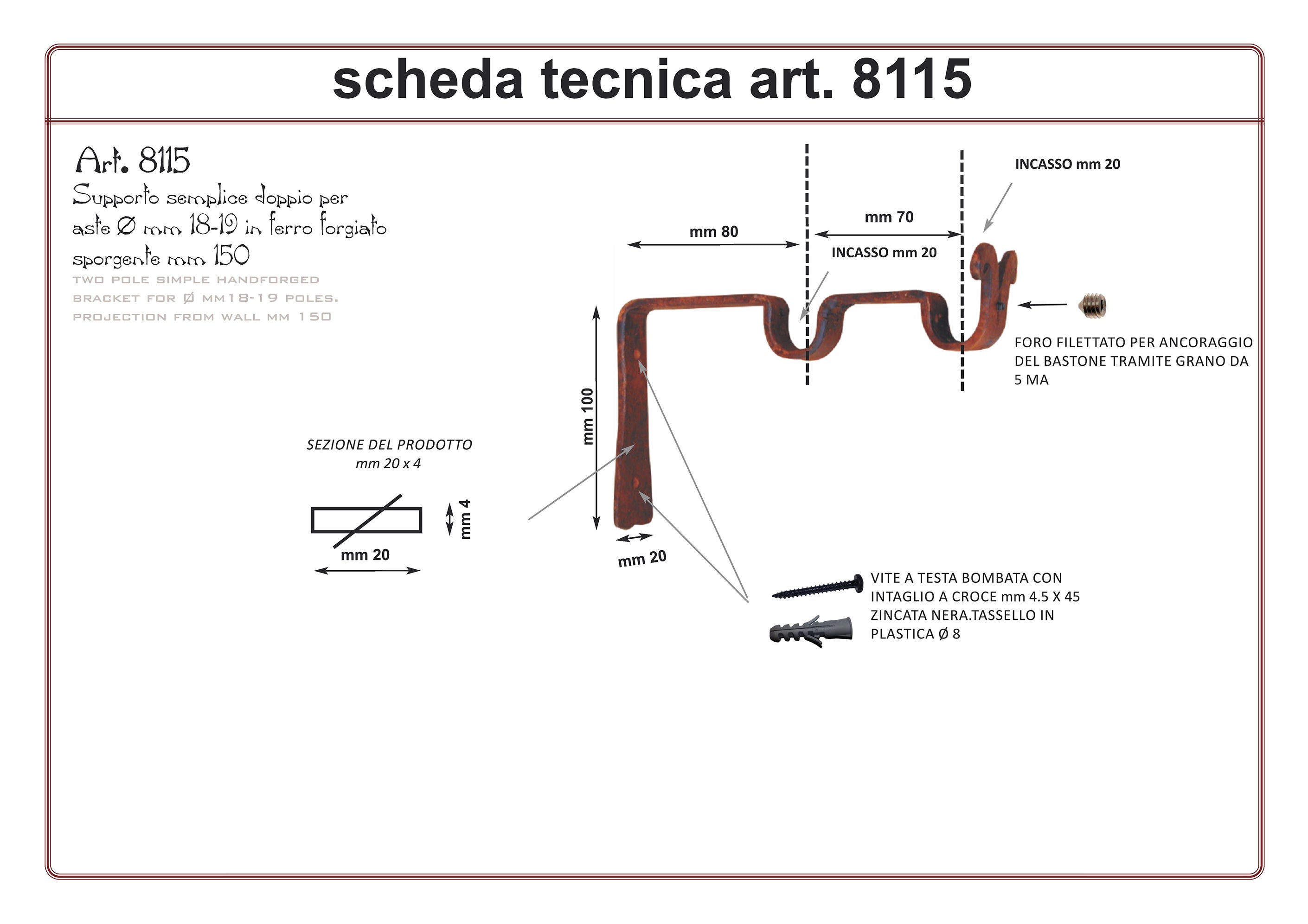 Simple double supports for rods. Handcrafted product made in Italy, particularly suitable for country villas, stone and rustic farmhouses, farmhouses and country houses, farmhouses, period residences, farms and farmhouses. The old iron finish is made with anti-rust products also suitable for outdoor use and finished with antiquing waxes. Being done by hand can have different shades between one product and another. It is possible to overpaint the product with any paint or treatment.