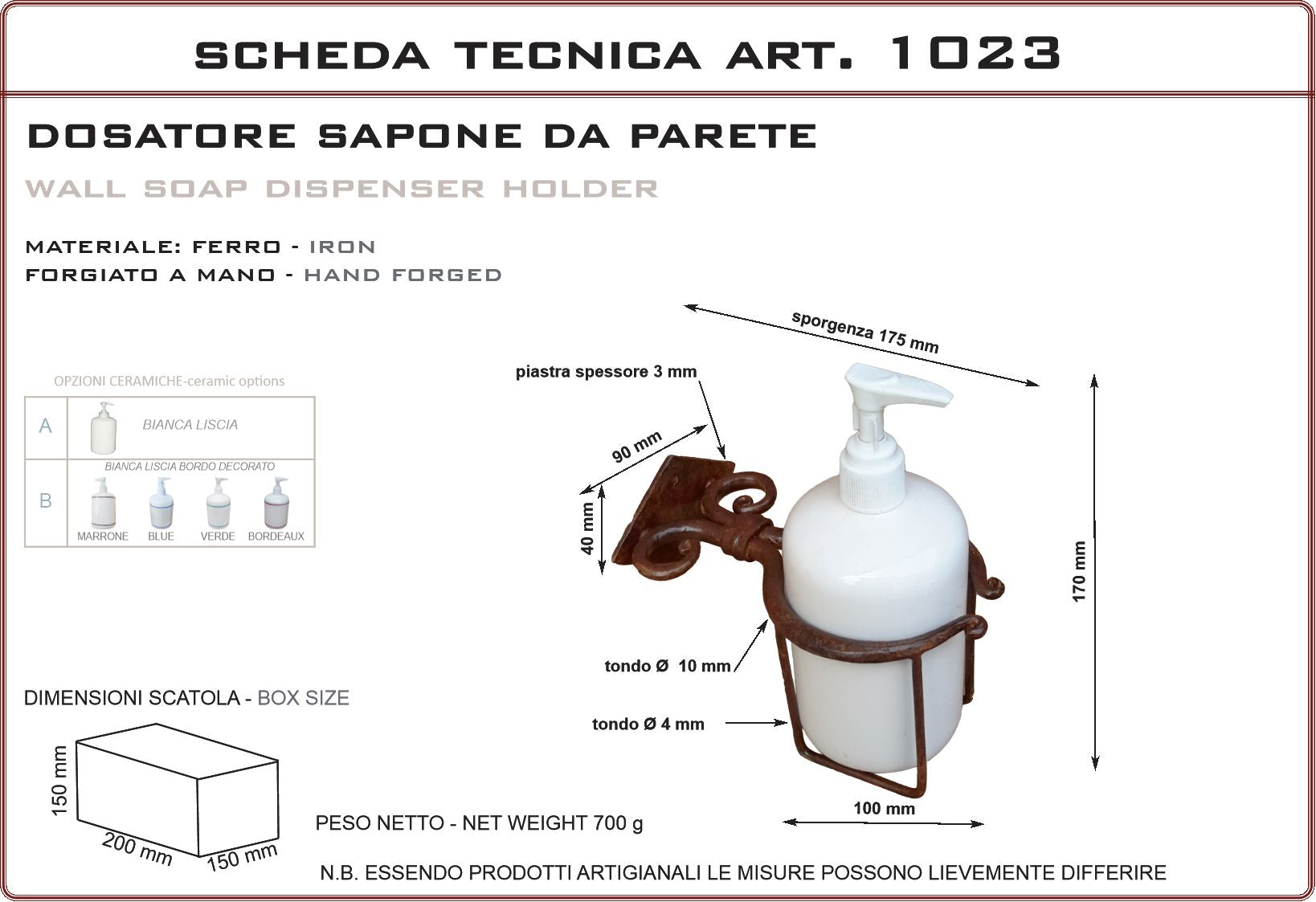Dosatore sapone da parete in ceramica con supporto in ferro forgiato. Prodotto artigianale realizzato in Italia, particolarmente adatto per ville di campagna,  casali in pietra e rustici, agriturismi e country houses,  cascine, residenze d' epoca,  masserie, masi. Finitura in  ferro vecchio realizzata con prodotti antiruggine e finita con cere antichizzanti color ruggine. Essendo  eseguita a mano può avere  differenti  tonalità  tra un prodotto e l’altro. É possibile sopraverniciare il prodotto con qualsiasi vernice o trattamento.
