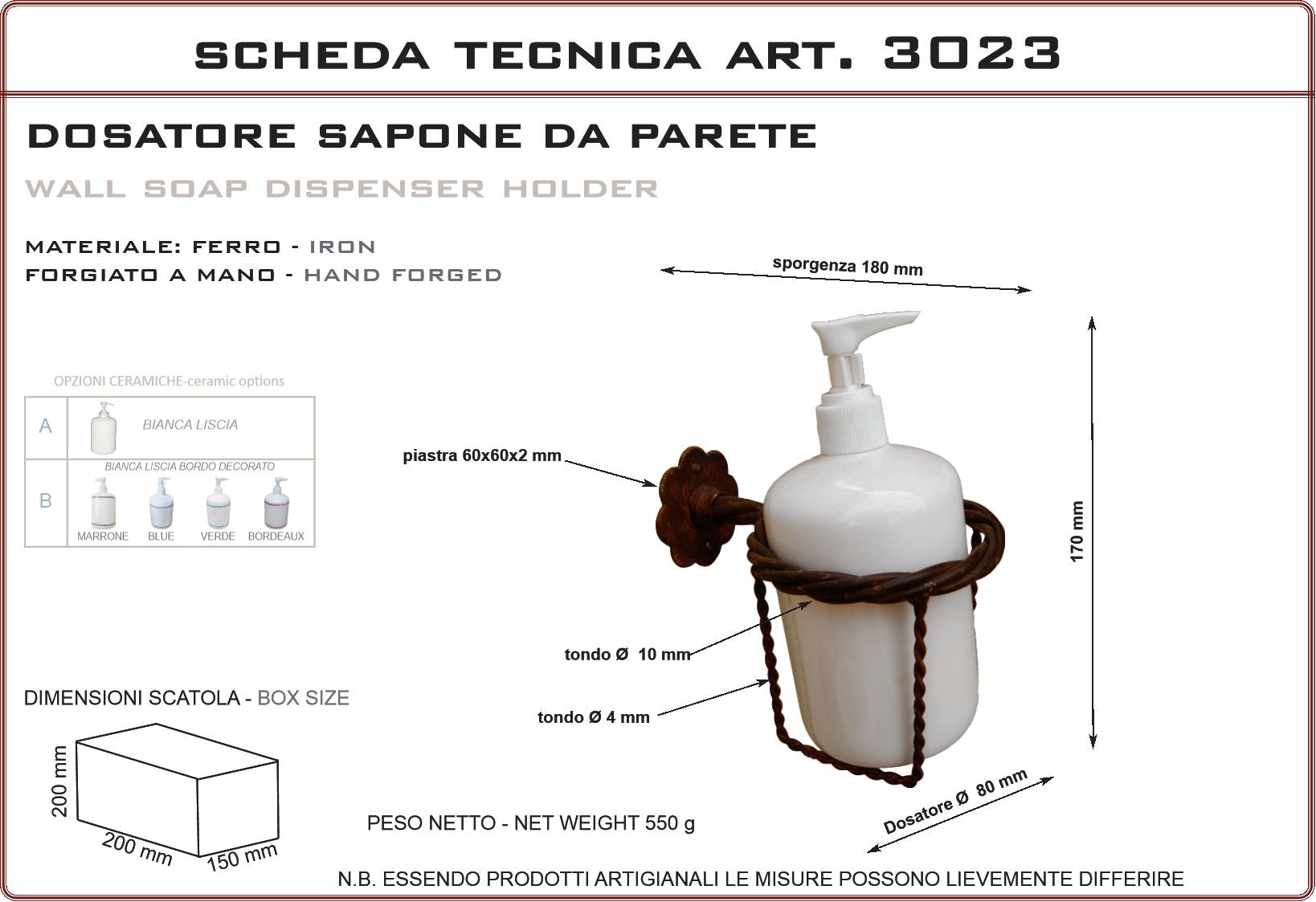 Dosatore sapone da parete in ceramica con supporto in ferro forgiato. Prodotto artigianale realizzato in Italia, particolarmente adatto per ville di campagna, casali in pietra e rustici, agriturismi e country houses, cascine, residenze d' epoca, masserie, masi. Finitura in ferro vecchio realizzata con prodotti antiruggine e finita con cere antichizzanti color ruggine. Essendo eseguita a mano può avere differenti tonalità tra un prodotto e l’altro. É possibile sopraverniciare il prodotto con qualsiasi vernice o trattamento.
