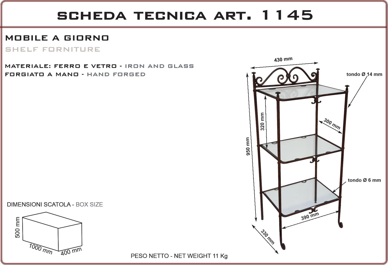 Mobile a giorno in ferro con tre ripiani in vetro. Prodotto artigianale realizzato in Italia, particolarmente adatto per ville di campagna, casali in pietra, rustici, agriturismi ,country houses, cascine, residenze d' epoca, masserie e masi. La finitura in ferro vecchio è realizzata con prodotti antiruggine e finita con cere antichizzanti color ruggine. Essendo eseguita a mano può avere differenti tonalità tra un prodotto e l’altro. É possibile sopraverniciare il prodotto con qualsiasi vernice o trattamento.