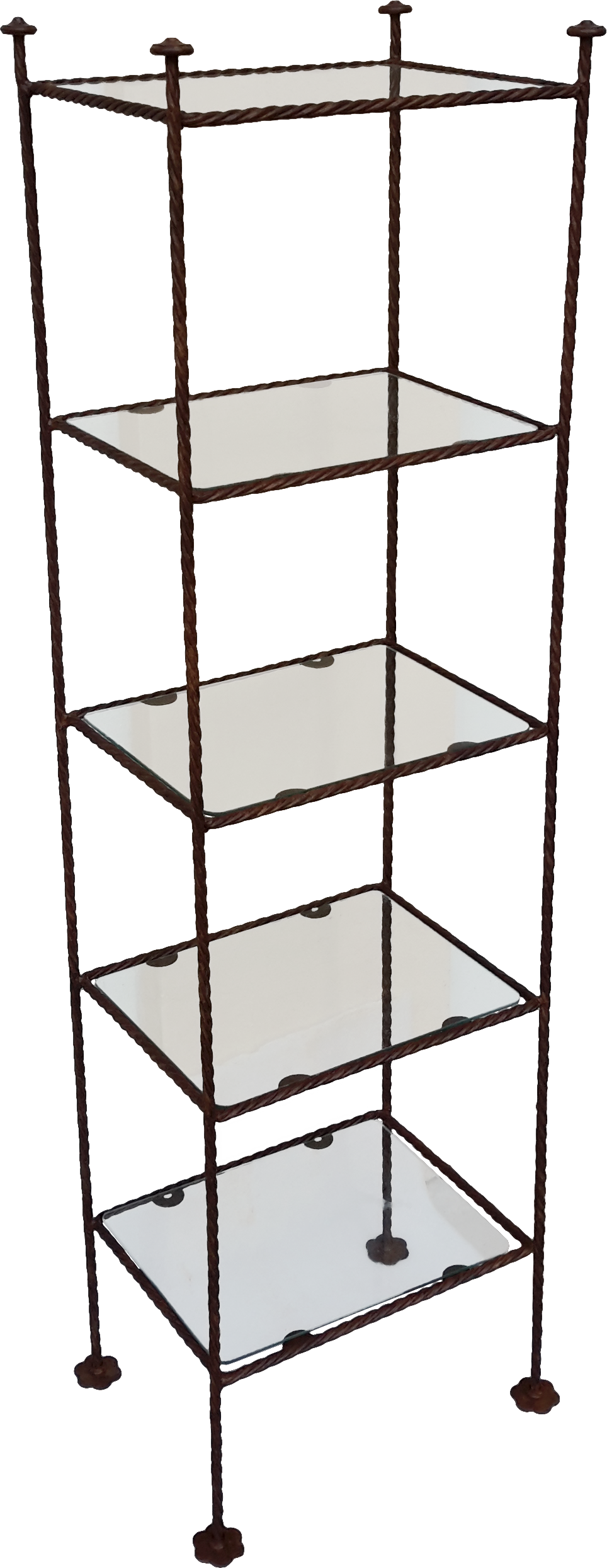Mobile in ferro con cinque ripiani in vetro. Prodotto artigianale realizzato in Italia, particolarmente adatto per ville di campagna, casali in pietra, rustici, agriturismi , country houses, cascine, residenze d' epoca, masserie e masi. La finitura in ferro vecchio è realizzata con prodotti antiruggine e finita con cere antichizzanti color ruggine. Essendo eseguita a mano può avere differenti tonalità tra un prodotto e l’altro. É possibile sopraverniciare il prodotto con qualsiasi vernice o trattamento.