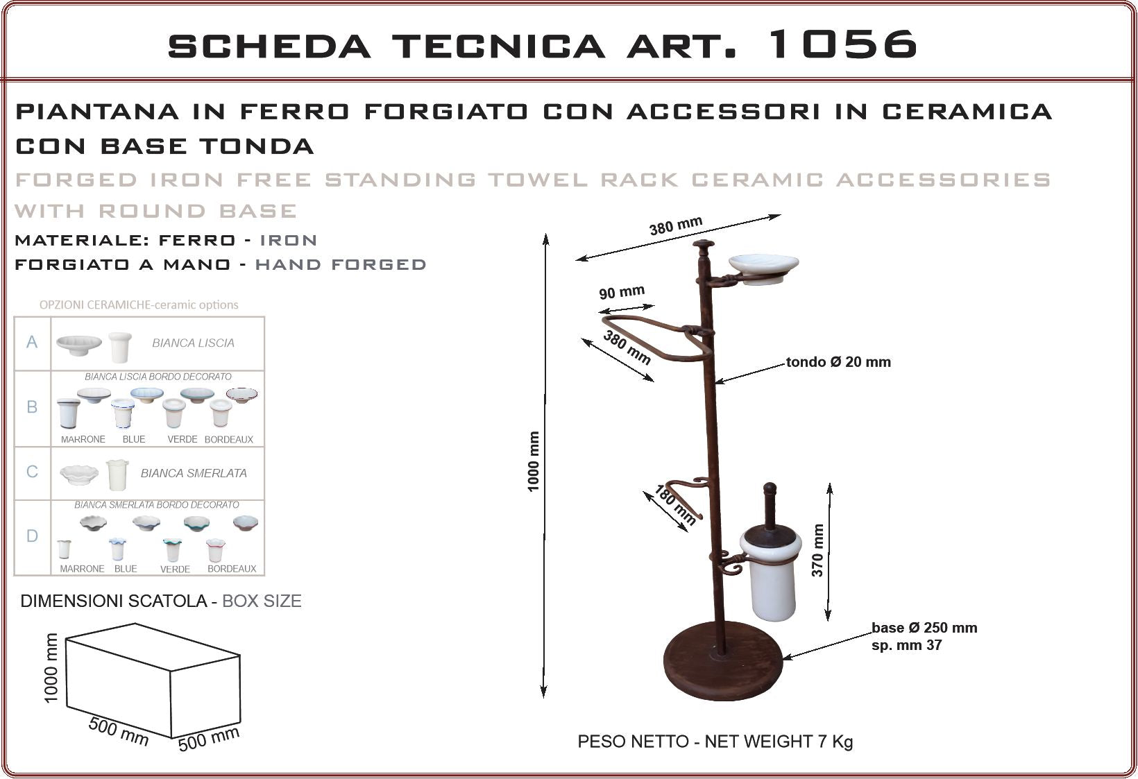 Forged iron free standing rack with ceramic accessories and round base. Handcrafted product made in Italy, particularly suitable for country villas, stone farmhouses and cottages, agritourisms and country houses, period residences, farms. The old iron finish is made with anti-rust products and finished with rust-colored antiquing waxes. Being done by hand, it can have different shades between one product and another. It is possible to overpaint the product with any paint or treatment.