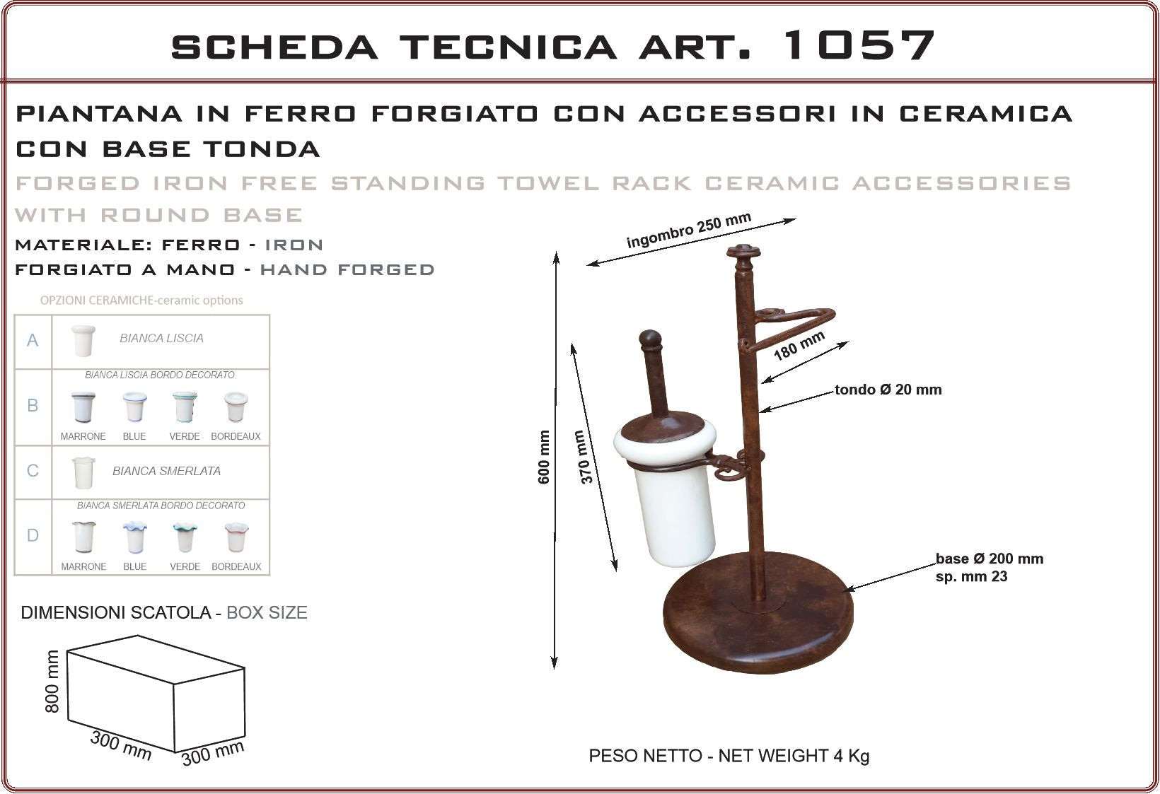 Small forged iron free standing rack with ceramic accessories and round base. Handcrafted product made in Italy, particularly suitable for country villas, stone farmhouses and cottages, agritourisms and country houses, period residences, farms. The old iron finish is made with anti-rust products and finished with rust-colored antiquing waxes. Being done by hand, it can have different shades between one product and another. It is possible to overpaint the product with any paint or treatment.