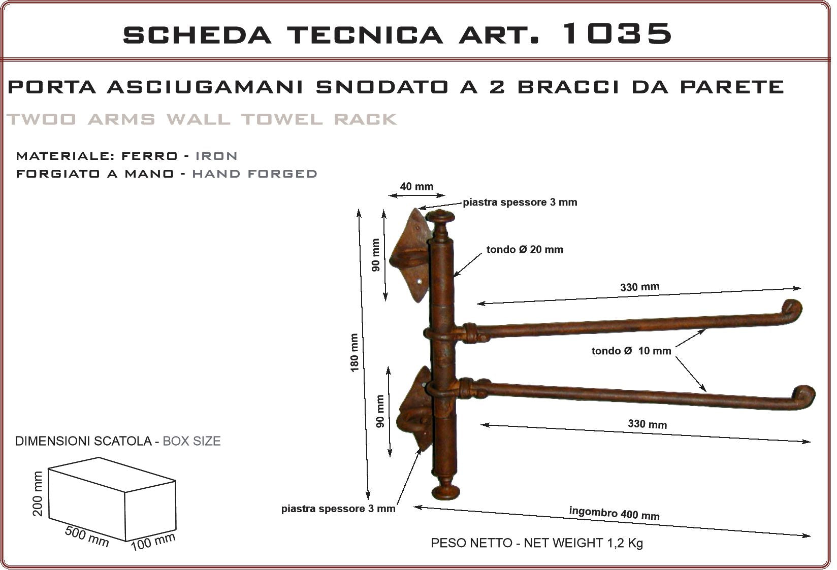 Porta asciugamano da parete in ferro forgiato snodato a 2 bracci. Prodotto artigianale realizzato in Italia, particolarmente adatto per ville di campagna, casali in pietra e rustici, agriturismi e country houses, cascine, residenze d' epoca, masserie, masi. Finitura in ferro vecchio realizzata con prodotti antiruggine e finita con cere antichizzanti color ruggine. Essendo eseguita a mano può avere differenti tonalità tra un prodotto e l’altro. É possibile sopraverniciare il prodotto con qualsiasi vernice o trattamento.