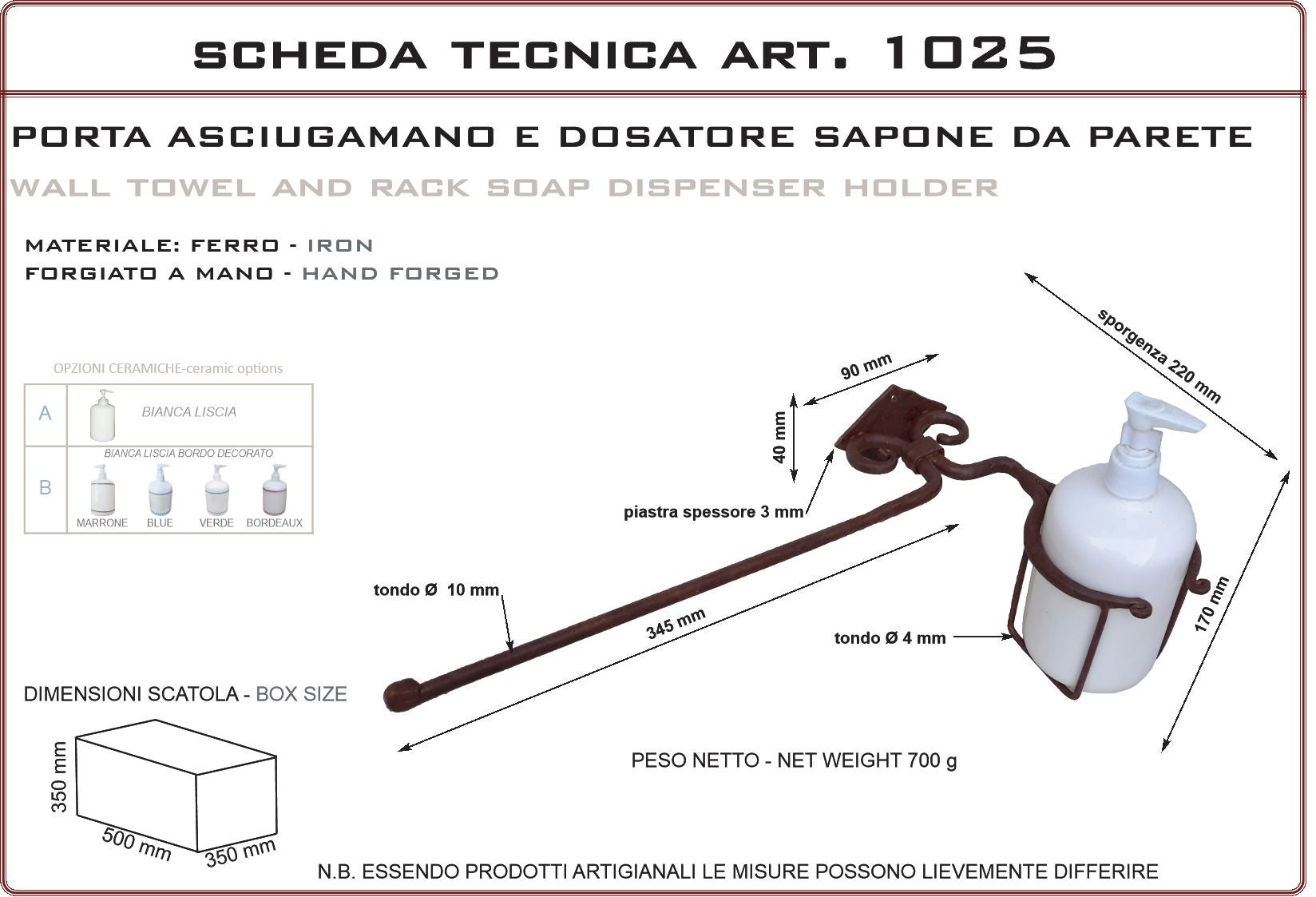 Porta asciugamano da parete in ferro forgiato/dosatore sapone in ceramica. Prodotto artigianale realizzato in Italia, particolarmente adatto per ville di campagna, casali in pietra e rustici, agriturismi e country houses, cascine, residenze d' epoca, masserie, masi. Finitura in ferro vecchio realizzata con prodotti antiruggine e finita con cere antichizzanti color ruggine. Essendo eseguita a mano può avere differenti tonalità tra un prodotto e l’altro. É possibile sopraverniciare il prodotto con qualsiasi vernice o trattamento.
