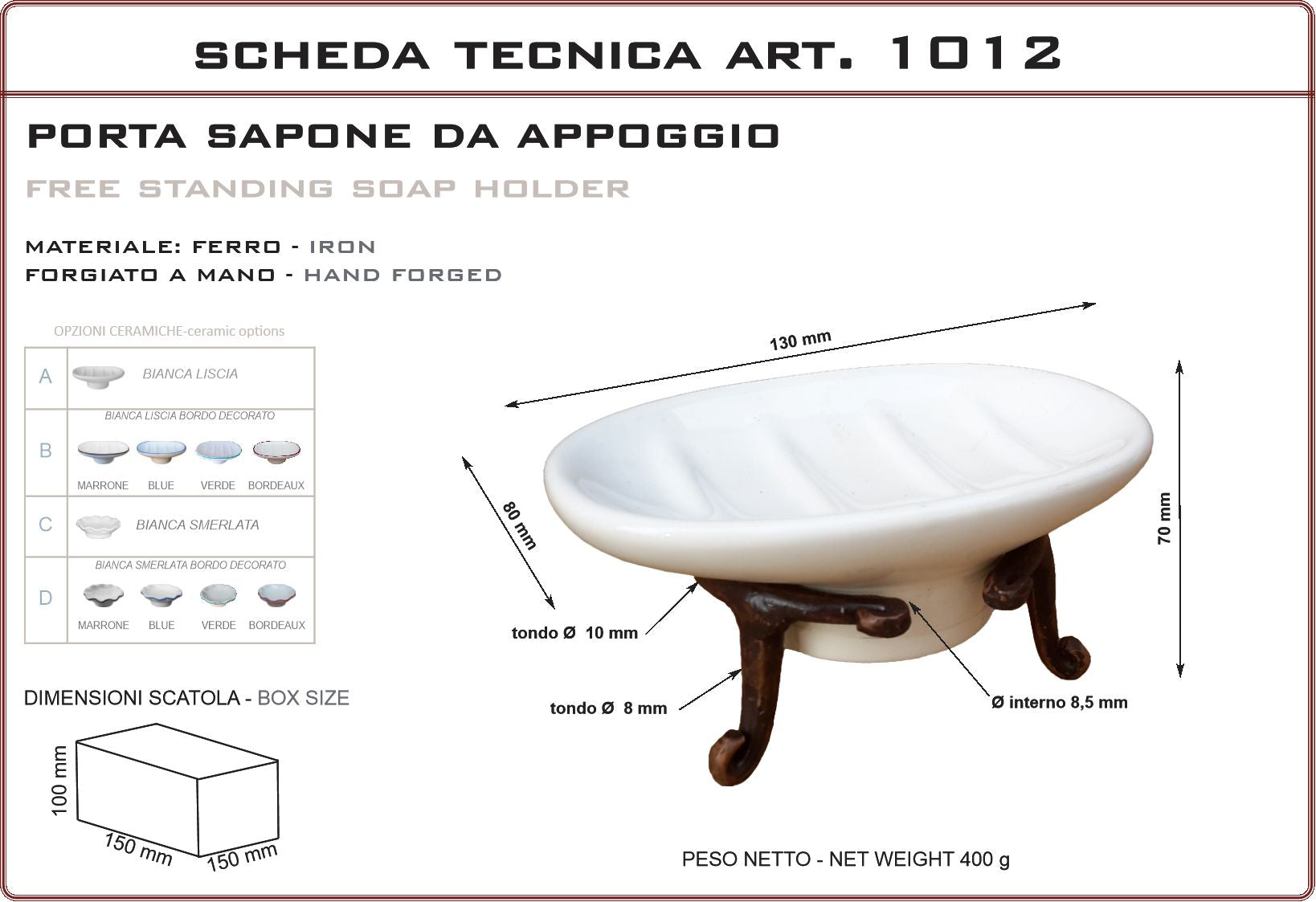 Porta sapone da appoggio in ceramica con supporto in ferro forgiato. Prodotto artigianale realizzato in Italia, particolarmente adatto per ville di campagna, casali in pietra e rustici, agriturismi e country houses, cascine, residenze d' epoca, masserie, masi. Finitura in ferro vecchio realizzata con prodotti antiruggine e finita con cere antichizzanti color ruggine. Essendo eseguita a mano può avere differenti tonalità tra un prodotto e l’altro. É possibile sopraverniciare il prodotto con qualsiasi vernice o trattamento.