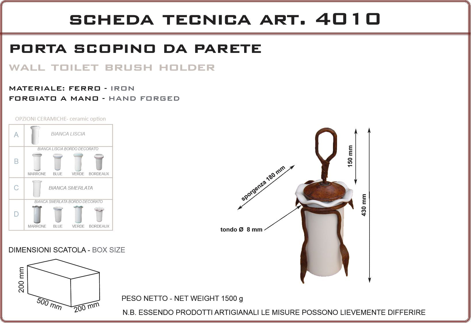 Porta scopino per wc da parete in ceramica con supporto in ferro forgiato. Prodotto artigianale realizzato in Italia, particolarmente adatto per ville di campagna, casali in pietra, rustici, agriturismi e country houses, cascine, residenze d' epoca, masserie e masi. La finitura in ferro vecchio è realizzata con prodotti antiruggine e finita con cere antichizzanti color ruggine. Essendo eseguita a mano può avere differenti tonalità tra un prodotto e l’altro. É possibile sopraverniciare il prodotto con qualsiasi vernice o trattamento.