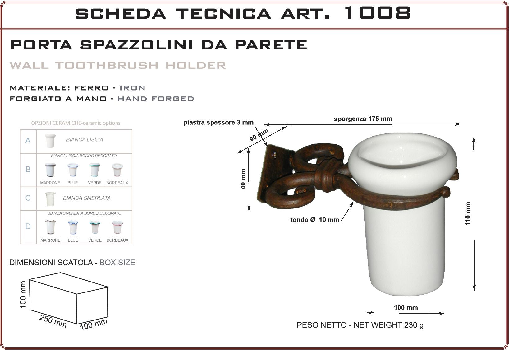 Porta spazzolini da parete in ceramica con supporto in ferro forgiato. Prodotto artigianale realizzato in Italia, particolarmente adatto per ville di campagna, casali in pietra e rustici, agriturismi e country houses, cascine, residenze d' epoca, masserie, masi. Finitura in ferro vecchio realizzata con prodotti antiruggine e finita con cere antichizzanti color ruggine. Essendo eseguita a mano può avere differenti tonalità tra un prodotto e l’altro. É possibile sopraverniciare il prodotto con qualsiasi vernice o trattamento.