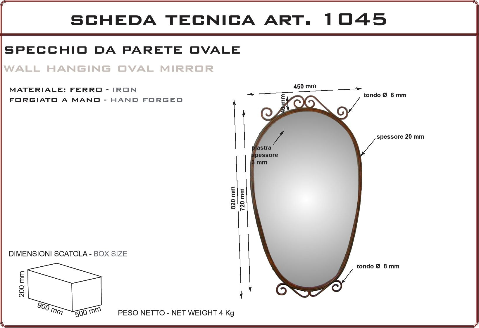 Specchio da parete ovale con ornamenti in ferro forgiato. Prodotto artigianale realizzato in Italia, particolarmente adatto per ville di campagna, casali in pietra , rustici, agriturismi , country houses, cascine, residenze d' epoca, masserie e masi. La finitura in ferro vecchio è realizzata con prodotti antiruggine e finita con cere antichizzanti color ruggine. Essendo eseguita a mano può avere differenti tonalità tra un prodotto e l’altro. É possibile sopraverniciare il prodotto con qualsiasi vernice o trattamento.