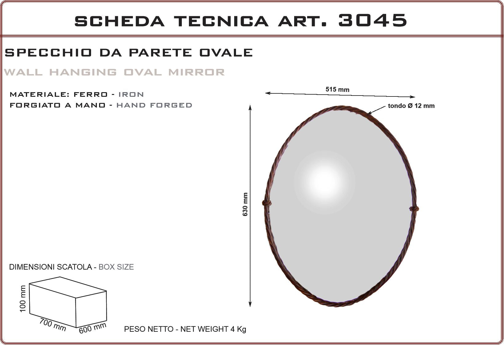 Specchio da parete ovale con ornamenti in ferro forgiato. Prodotto artigianale realizzato in Italia, particolarmente adatto per ville di campagna, casali in pietra , rustici, agriturismi , country houses, cascine, residenze d' epoca, masserie e masi. La finitura in ferro vecchio è realizzata con prodotti antiruggine e finita con cere antichizzanti color ruggine. Essendo eseguita a mano può avere differenti tonalità tra un prodotto e l’altro. É possibile sopraverniciare il prodotto con qualsiasi vernice o trattamento.