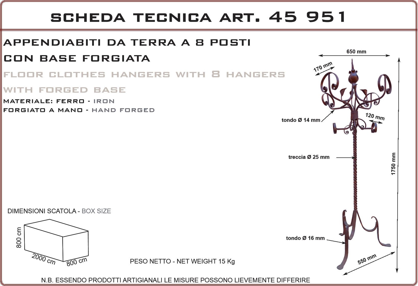 Appendiabiti da terra a 8 posti, con base forgiata. Prodotto artigianale realizzato in Italia, particolarmente adatto per ville di campagna, casali in pietra e rustici, agriturismi e country houses, cascine, residenze d' epoca, masserie e masi. Finitura in ferro vecchio realizzata con prodotti antiruggine e finita con cere antichizzanti. Essendo eseguita a mano può avere differenti tonalità tra un prodotto e l’altro. É possibile sopraverniciare il prodotto con qualsiasi vernice o trattamento.
