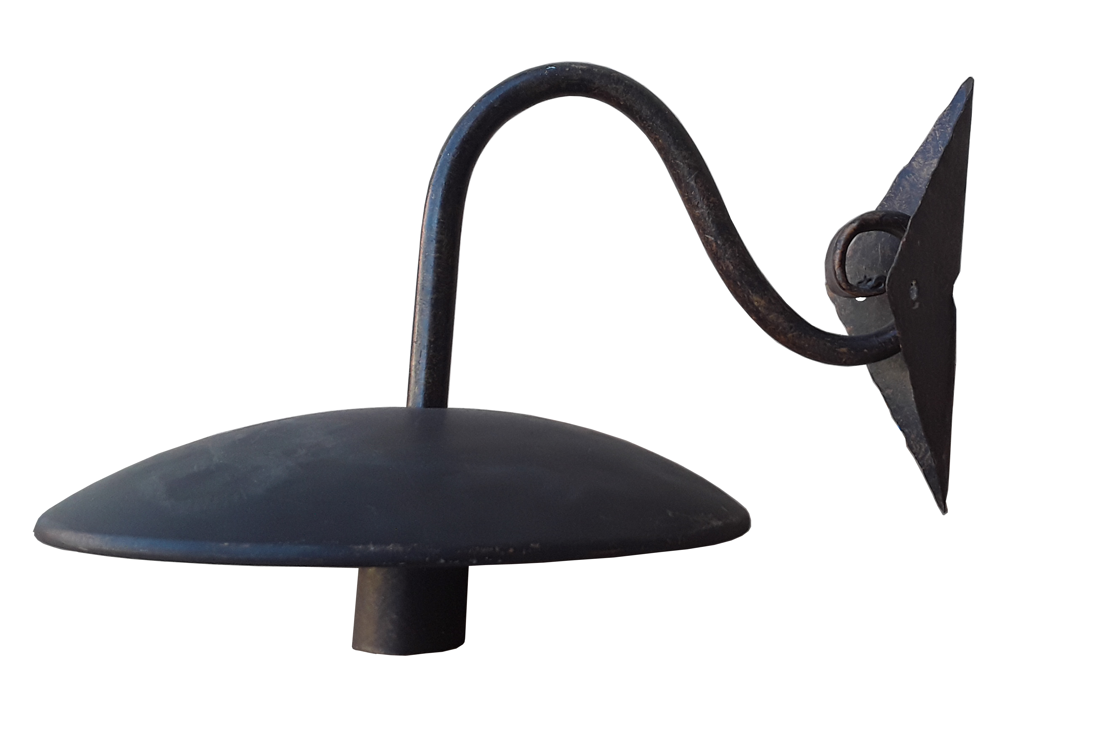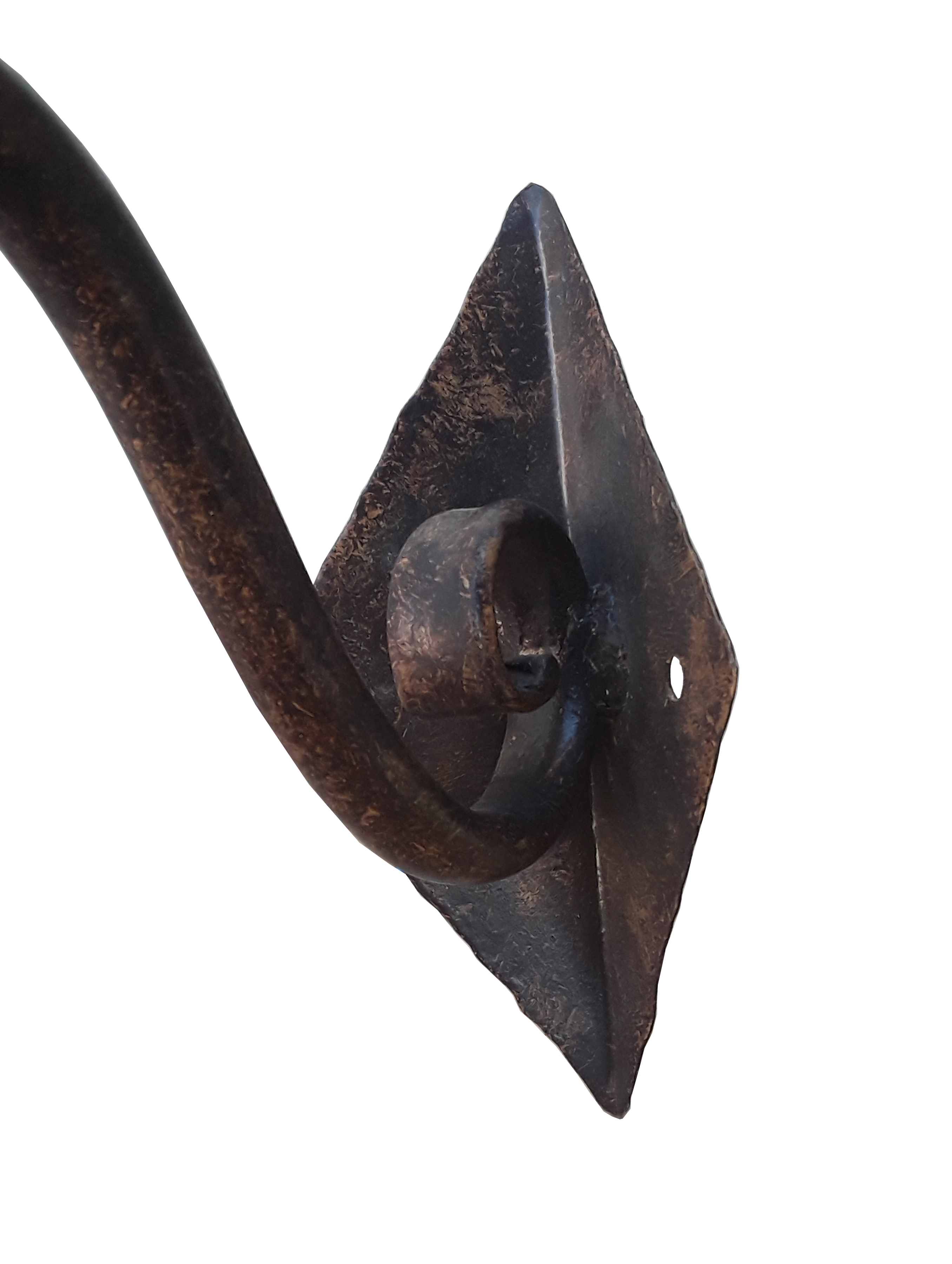 Small indoor and outdoor wall lamp with a corner plate, made of hand-forged wrought iron. Artisanal product made in Italy, particularly suitable for country villas, stone farmhouses and rustic houses, agritourisms and country houses, farmhouses, period residences, and farmhouses. Iron-covered plastic lamp holder. Antique iron finish applied with outdoor anti-rust products and finished with rust-colored antique waxes. Being handcrafted, the shade may vary from piece to piece. The product can be overpainted with any paint or treatment.