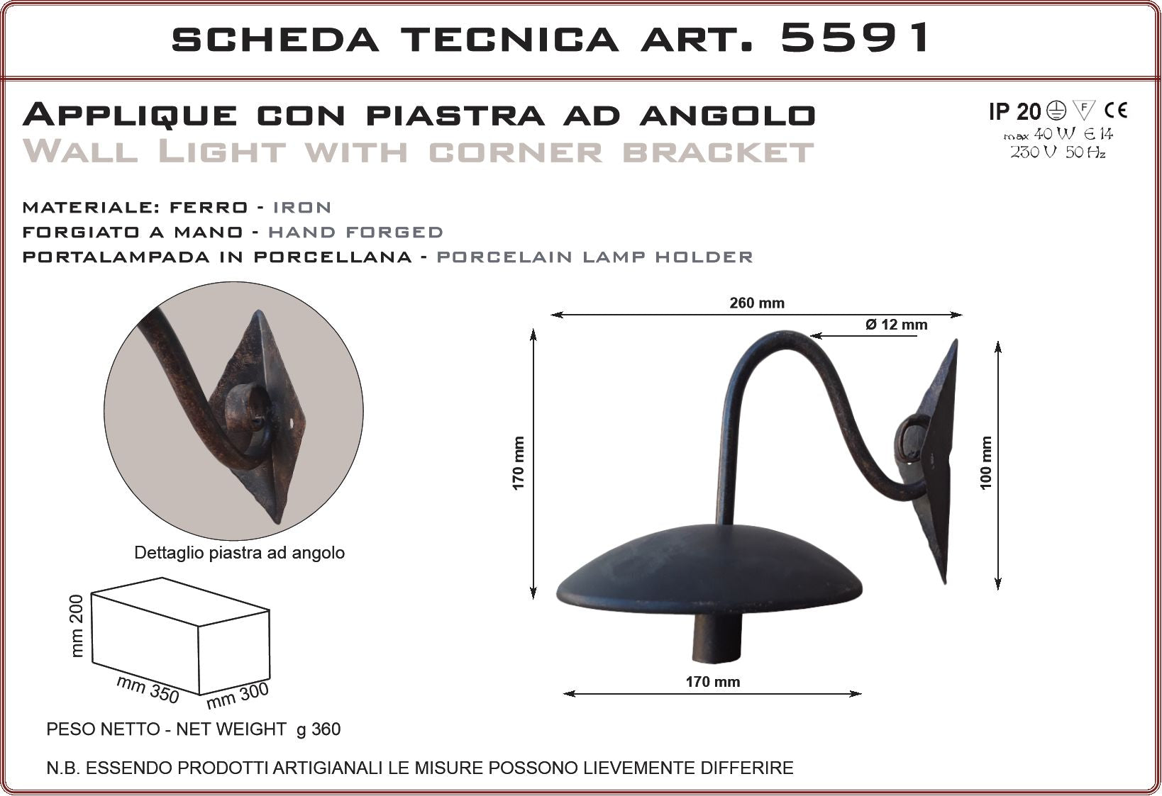 Lampada da parete per interno ed esterno di piccole dimensioni con piastra ad angolo, in ferro battuto, forgiato a mano. Prodotto artigianale realizzato in Italia, particolarmente adatto per ville di campagna, casali in pietra e rustici, agriturismi e country houses, cascine, residenze d' epoca, masserie, masi. Portalampada in plastica rivestito in ferro. Finitura in ferro vecchio realizzata con prodotti antiruggine da esterno e finita con cere antichizzanti color ruggine. Essendo eseguita a mano può avere differenti tonalità tra un prodotto e l’altro. É possibile sopraverniciare il prodotto con qualsiasi vernice o trattamento.