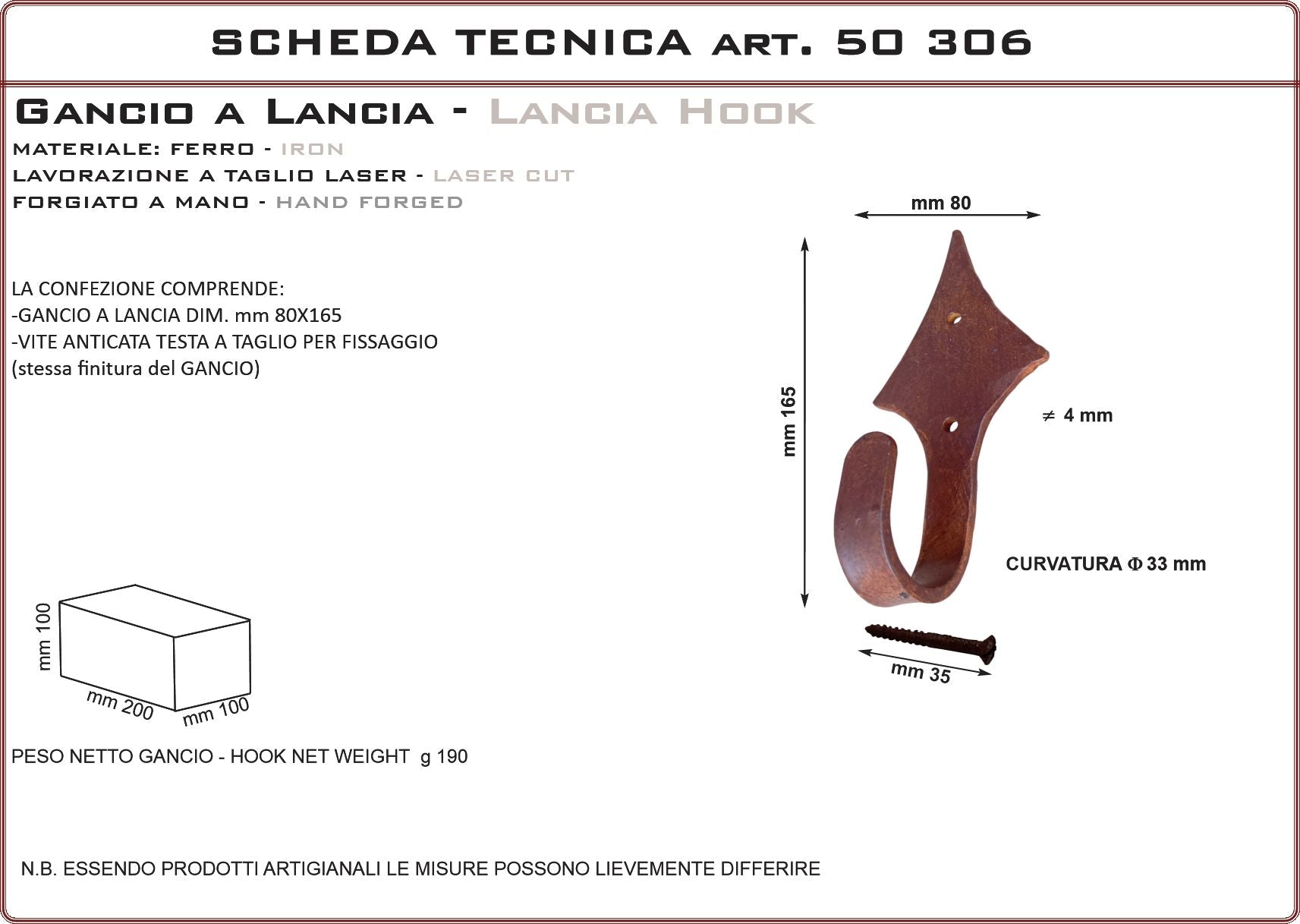Gancio modello lancia in ferro tagliato al plasma, forgiato e battuto a mano. Prodotto artigianale realizzato in Italia. Disponibile in 4 modelli. Particolarmente adatto per ville di campagna, casali in pietra e rustici, agriturismi e country houses, cascine, residenze d' epoca, masserie, masi. La finitura ferro vecchio è realizzata con prodotti antiruggine adatti anche per esterno e finita con cere antichizzanti color ruggine , è eseguita a mano e può avere differenti tonalità tra un prodotto e l’altro. E’ possibile sopraverniciare il prodotto con qualsiasi vernice o trattamento.