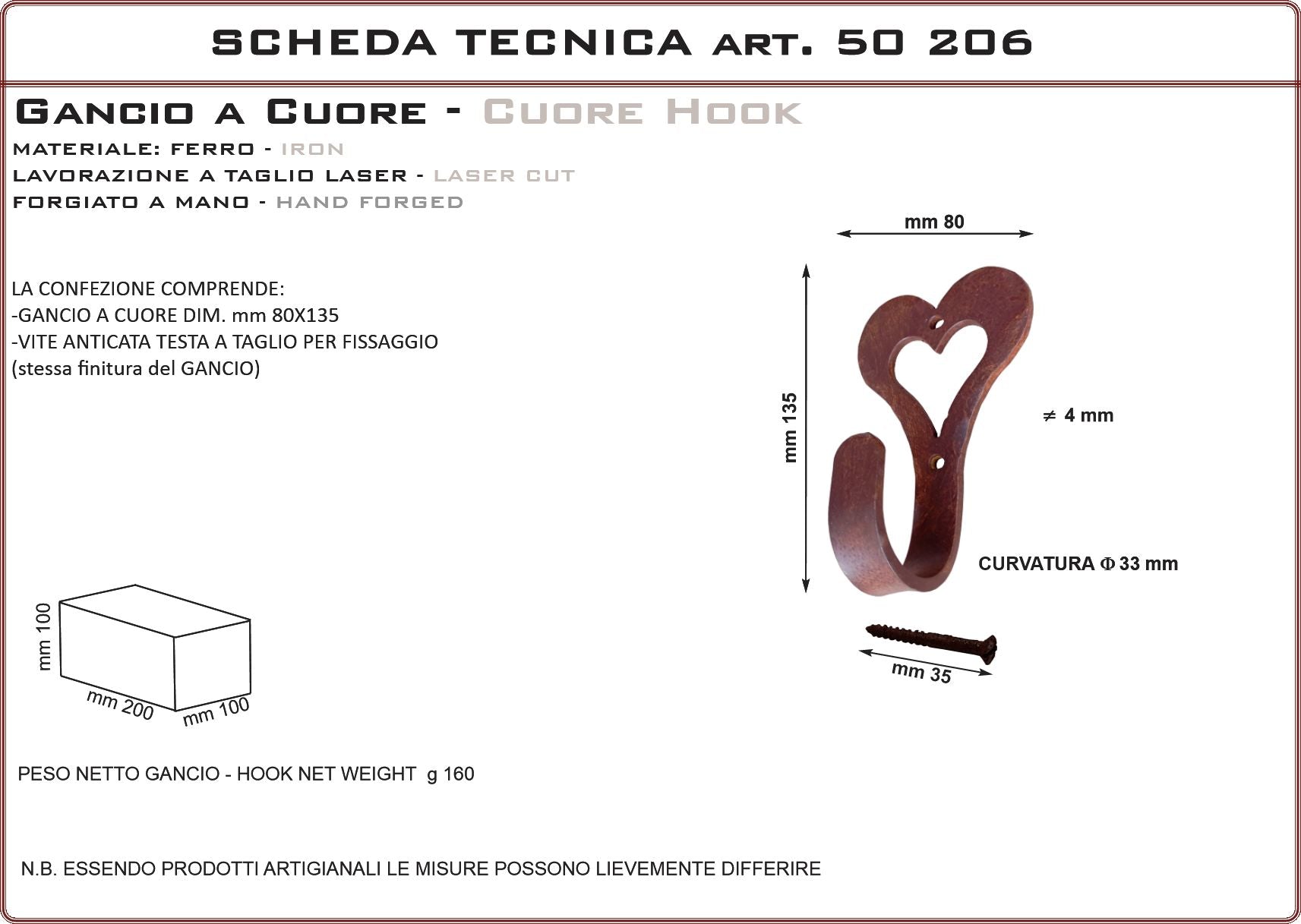 Gancio modello cuore in ferro tagliato al plasma, forgiato e battuto a mano. Prodotto artigianale realizzato in Italia. Disponibile in 4 modelli. Particolarmente adatto per ville di campagna, casali in pietra e rustici, agriturismi e country houses, cascine, residenze d' epoca, masserie, masi. La finitura ferro vecchio è realizzata con prodotti antiruggine adatti anche per esterno e finita con cere antichizzanti color ruggine , è eseguita a mano e può avere differenti tonalità tra un prodotto e l’altro. E’ possibile sopraverniciare il prodotto con qualsiasi vernice o trattamento.