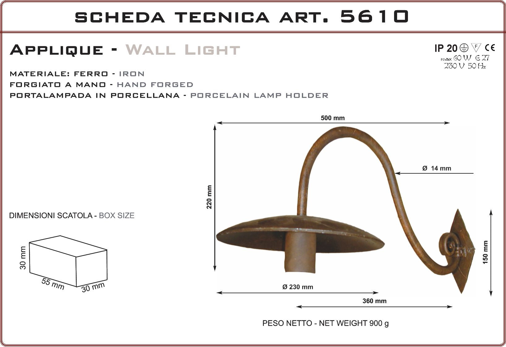 Lampada da parete per interno ed esterno di piccole dimensioni in ferro battuto, forgiato a mano. Prodotto artigianale realizzato in Italia, particolarmente adatto per ville di campagna, casali in pietra e rustici, agriturismi e country houses, cascine, residenze d'epoca, masserie, masi. Portalampada in plastica rivestito in ferro, finitura in ferro vecchio realizzata con prodotti antiruggine da esterno e finita con cere antichizzanti color ruggine. Essendo eseguita a mano può avere differenti tonalità tra un prodotto e l’altro. É possibile sopraverniciare il prodotto con qualsiasi vernice o trattamento.