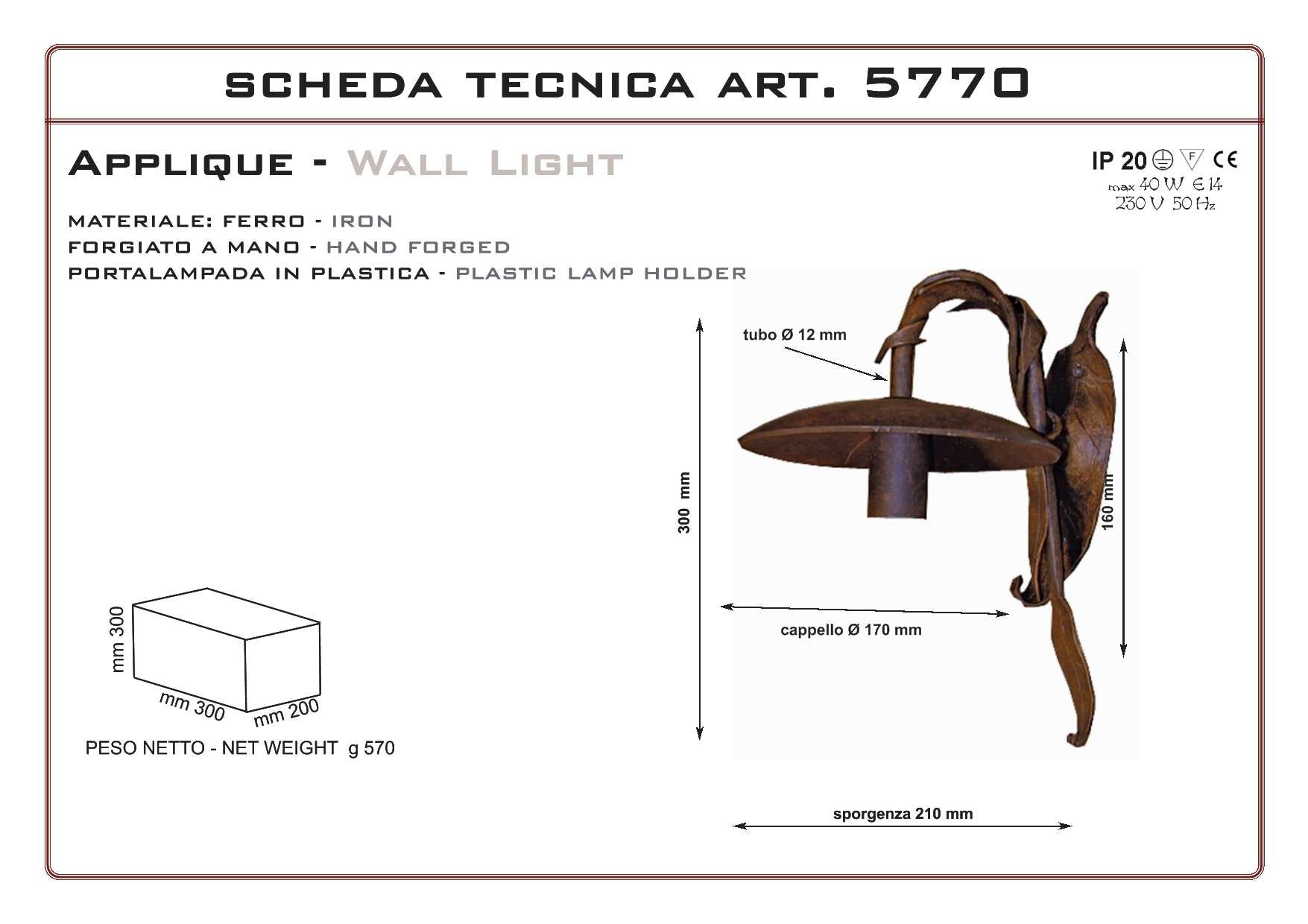 Lampada a parete di piccole dimensioni in ferro battuto, stile Liberty arte povera, forgiata a mano. Prodotto artigianale realizzato in Italia, particolarmente adatto per ville di campagna, casali in pietra e rustici, agriturismi e country houses, cascine, residenze d' epoca, masserie, masi. Portalampada in plastica rivestito in ferro, finitura in ferro vecchio realizzata con prodotti antiruggine da esterno e finita con cere antichizzanti color ruggine. Essendo eseguita a mano può avere differenti tonalità tra un prodotto e l’altro. É possibile sopraverniciare il prodotto con qualsiasi vernice o trattamento.