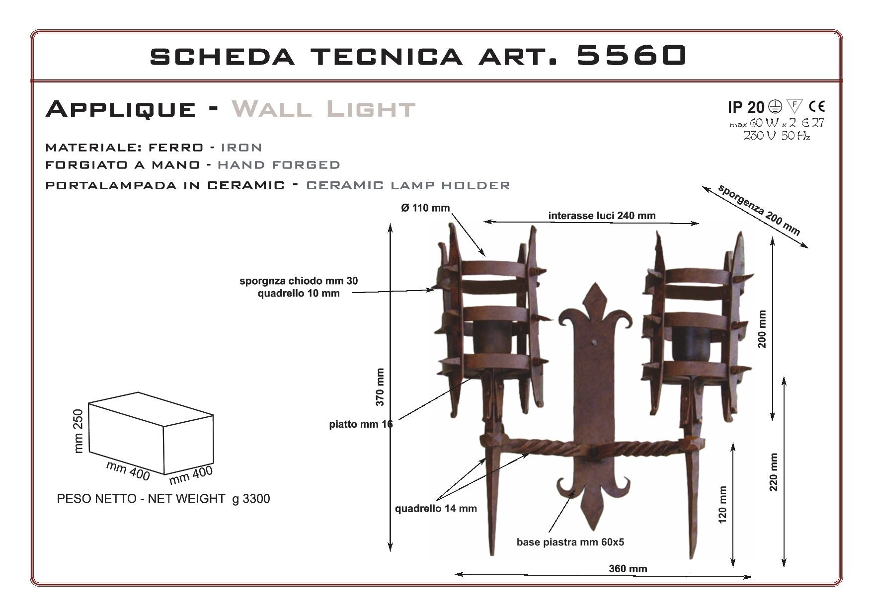 Lampada a due luci da parete per interno e porticati di piccole dimensioni in ferro battuto, forgiato a mano, trasformabile in portacandele, stile medioevale, ideale anche per porticati. Prodotto artigianale realizzato in Italia, particolarmente adatto per ville di campagna, casali in pietra e rustici, agriturismi e country houses, cascine, residenze d'epoca, masserie, masi. Portalampada in plastica rivestito in ferro, finitura in ferro vecchio realizzata con prodotti antiruggine da esterno e finita con cere antichizzanti color ruggine. Essendo eseguita a mano può avere differenti tonalità tra un prodotto e l’altro. É possibile sopraverniciare il prodotto con qualsiasi vernice o trattamento.