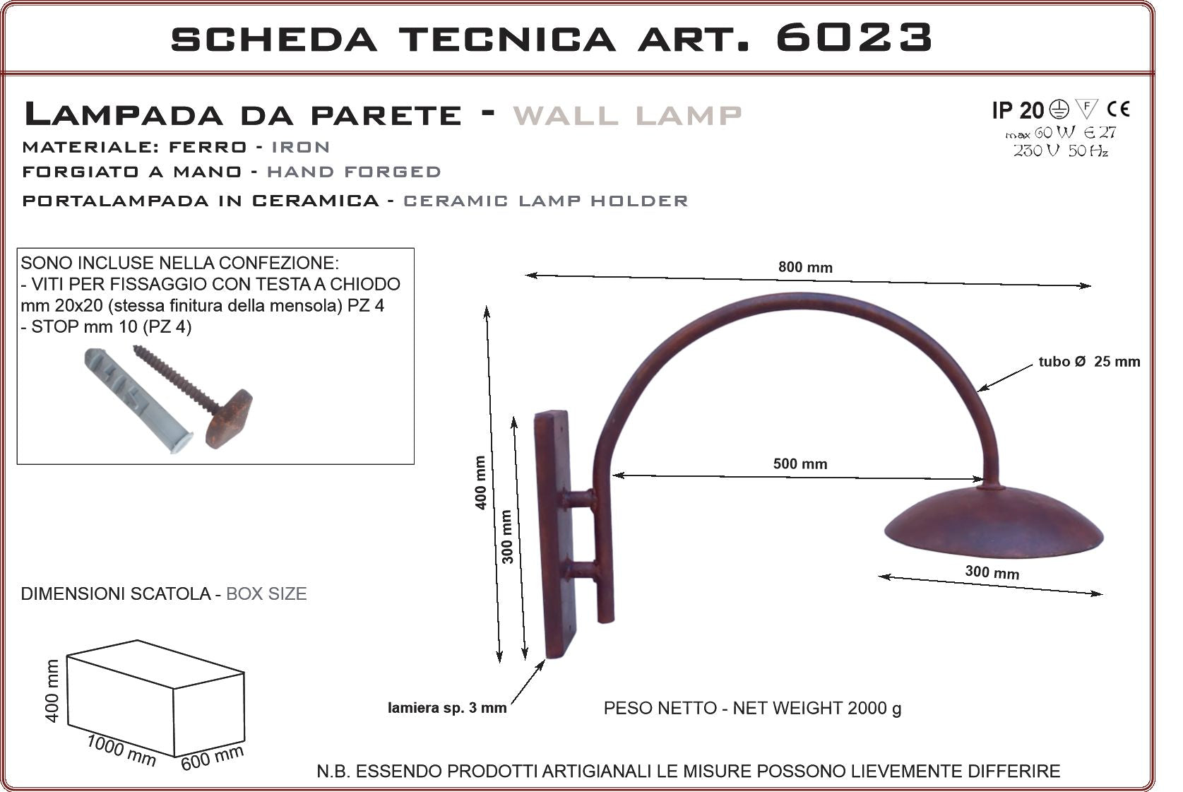 Lampada da parete in ferro battuto, stile arte povera. Prodotto artigianale realizzato in Italia, particolarmente adatto per ville di campagna, casali in pietra e rustici, agriturismi e country houses, cascine, residenze d'epoca, masserie e masi. La finitura ferro vecchio è realizzata con prodotti antiruggine da esterno e finita con cere antichizzanti. Essendo eseguita a mano può avere differenti tonalità tra un prodotto e l’altro. É possibile sopraverniciare il prodotto con qualsiasi vernice o trattamento.