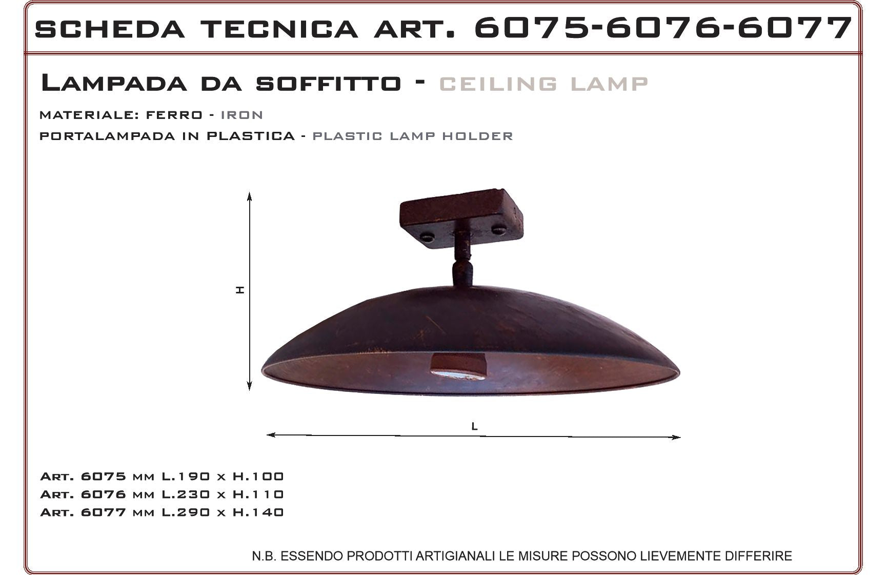 Lampada da soffitto di piccole dimensioni in ferro battuto, stile arte povera. Prodotto artigianale realizzato in Italia, particolarmente adatto per ville di campagna, casali in pietra e rustici, agriturismi e country houses, cascine, residenze d' epoca, masserie, masi. Portalampada in ceramica rivestito in ferro, finitura in ferro vecchio realizzata con prodotti antiruggine da esterno e finita con cere antichizzanti color ruggine. La finitura ferro vecchio è realizzata con prodotti antiruggine adatti anche per esterno e finita con cere antichizzanti color ruggine , è eseguita a mano e può avere differenti tonalità tra un prodotto e l’altro. É possibile sopraverniciare il prodotto con qualsiasi vernice o trattamento.
