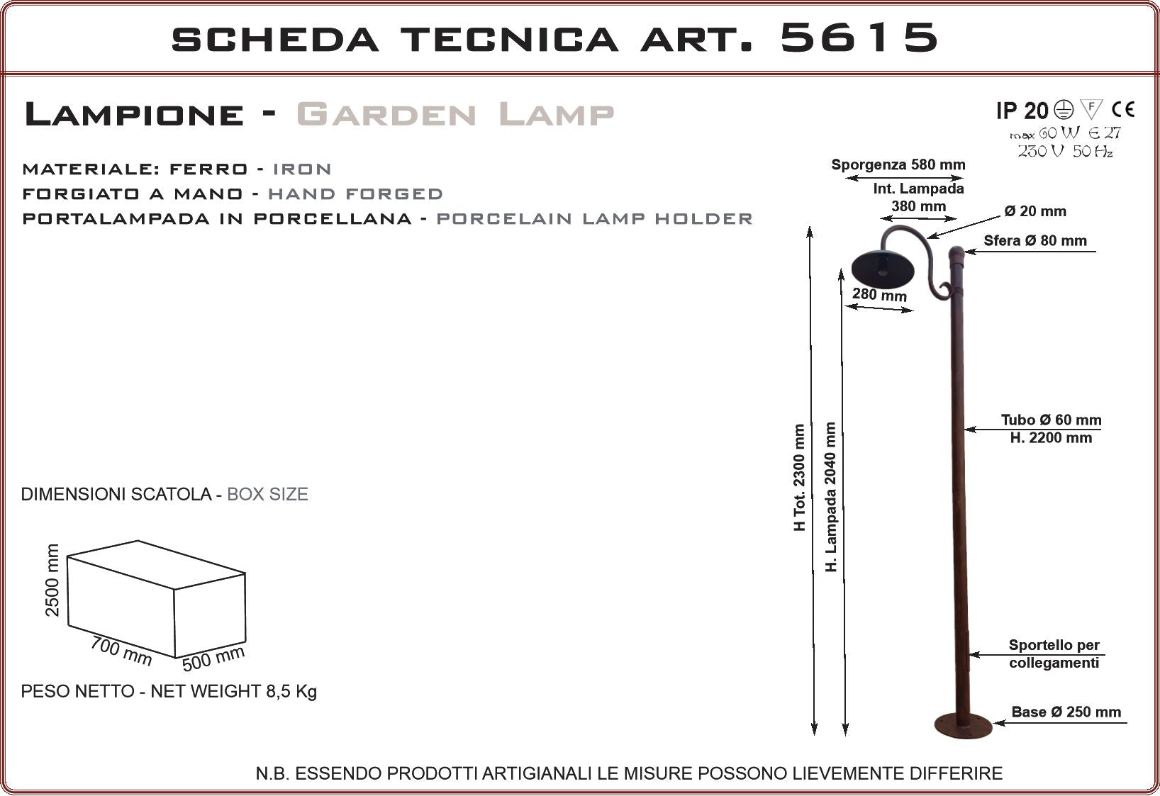 Tradizionale lampione da giardino a una luce, in arte povera. Prodotto artigianale realizzato in Italia, particolarmente adatto per ville di campagna, casali in pietra e rustici, agriturismi e country houses, cascine, residenze d' epoca, masserie e masi. Portalampada in plastica rivestito in ferro, finitura in ferro vecchio realizzata con prodotti antiruggine da esterno e finita con cere antichizzanti. Essendo eseguita a mano può avere differenti tonalità tra un prodotto e l’altro. É possibile sopraverniciare il prodotto con qualsiasi vernice o trattamento.