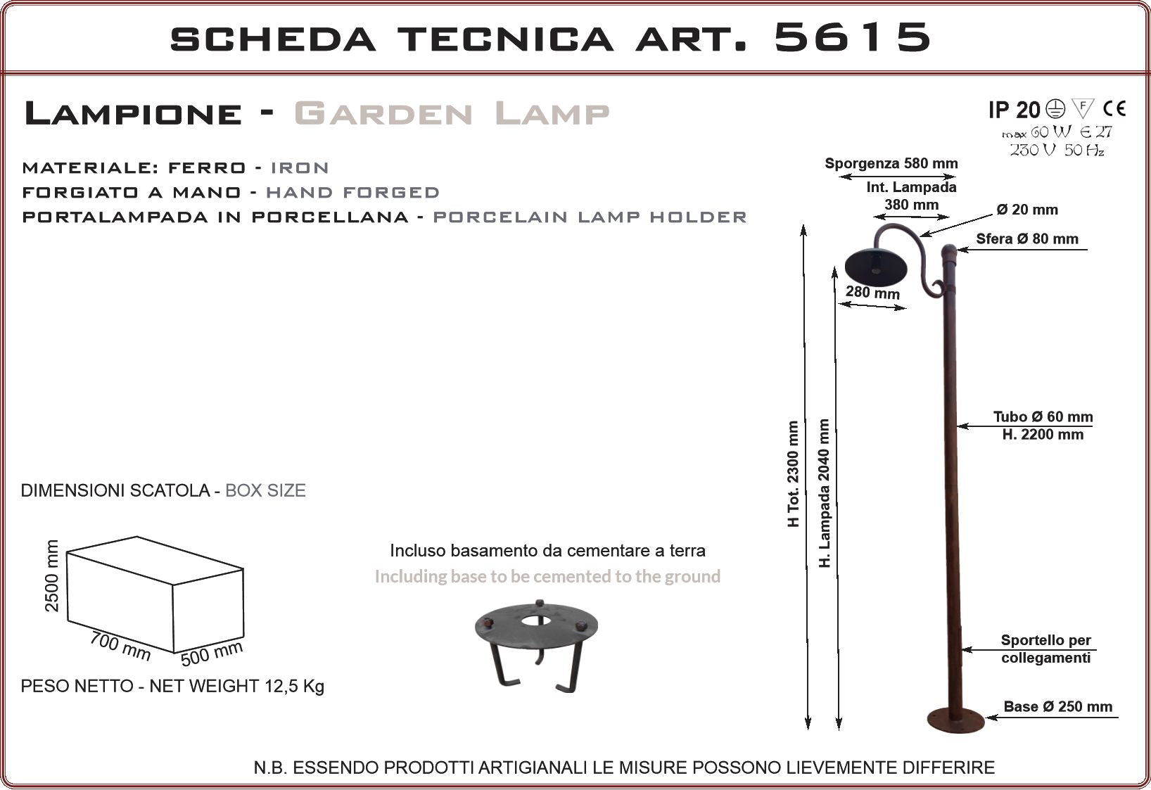 Tradizionale lampione da giardino a una luce, in arte povera. Prodotto artigianale realizzato in Italia, particolarmente adatto per ville di campagna, casali in pietra e rustici, agriturismi e country houses, cascine, residenze d' epoca, masserie e  masi. Portalampada in plastica rivestito in ferro, finitura in  ferro vecchio realizzata con prodotti antiruggine da esterno e finita con cere antichizzanti. Essendo  eseguita a mano può avere  differenti  tonalità  tra un prodotto e l’altro. É possibile sopraverniciare il prodotto con qualsiasi vernice o trattamento.