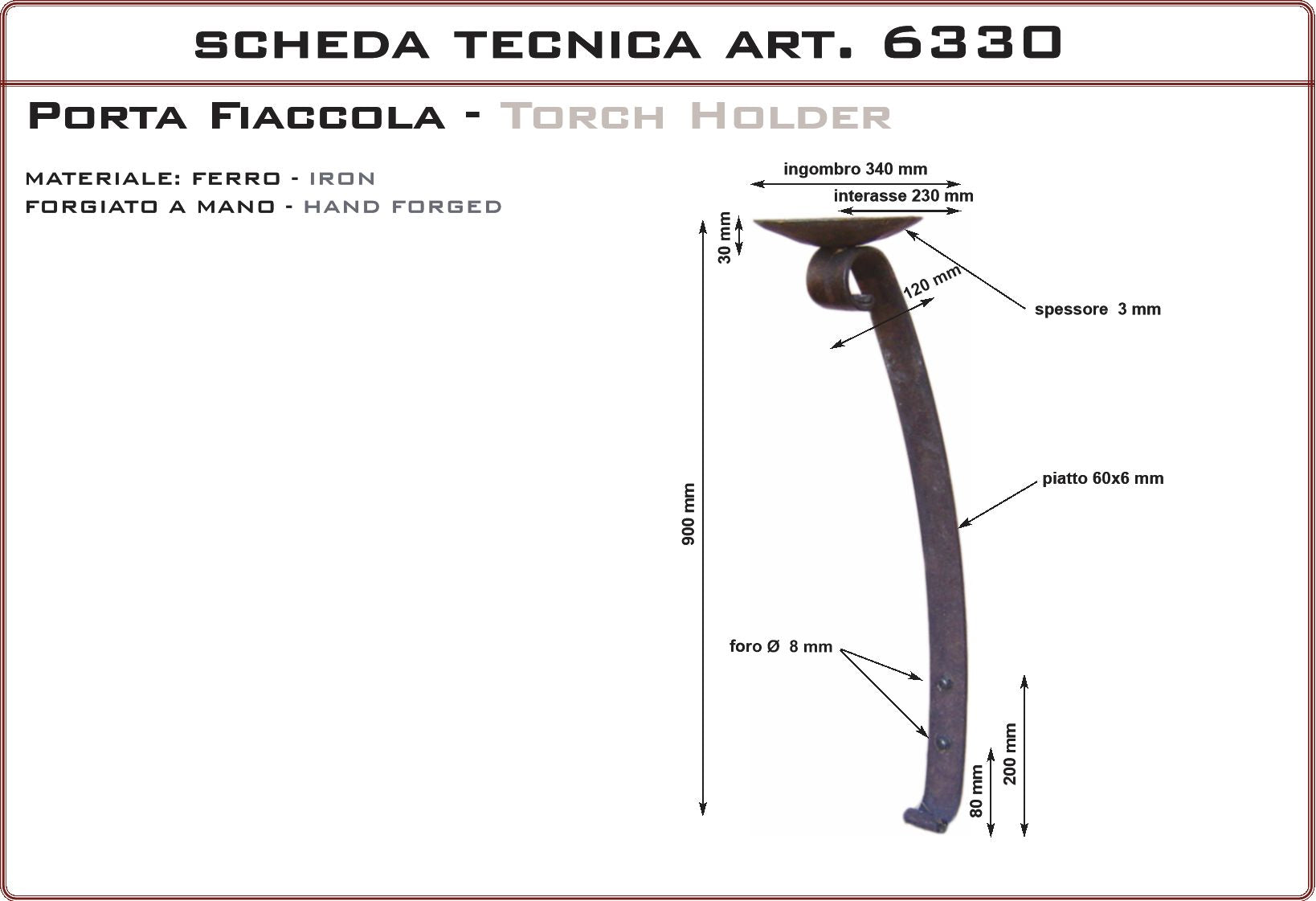 Tradizionale portafiaccola da parete per interno ed esterno in stile medievale. Prodotto artigianale realizzato in Italia, particolarmente adatto per ville di campagna, casali in pietra, rustici, agriturismi, country houses, cascine, residenze d' epoca, masserie e masi. Portafiaccola con finitura in ferro vecchio realizzata con prodotti antiruggine da esterno e finita con cere antichizzanti color ruggine. Essendo eseguita a mano può avere differenti tonalità tra un prodotto e l’altro. É possibile sopraverniciare il prodotto con qualsiasi vernice o trattamento.